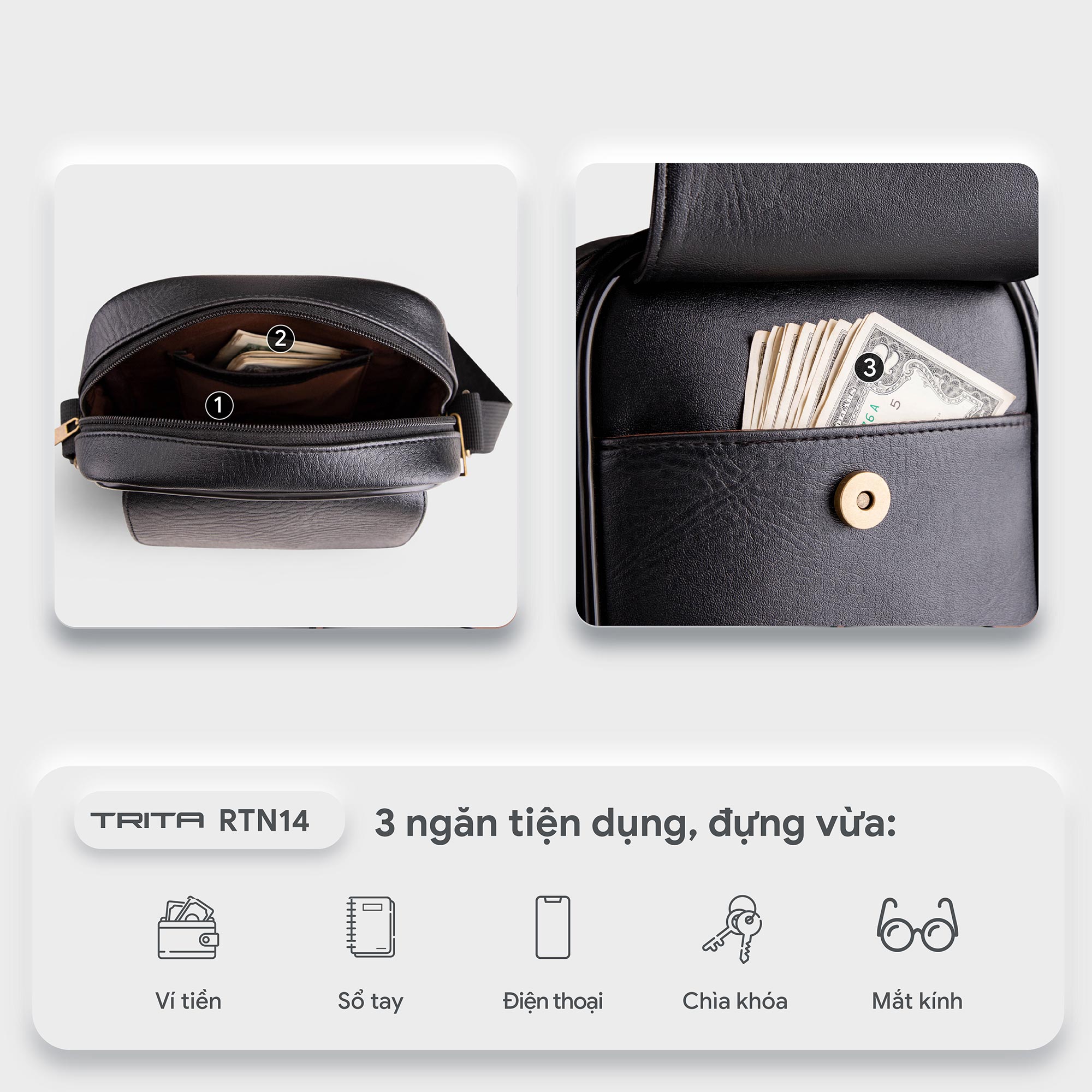 Mẫu túi đeo chéo nam mang hơi hướng cổ điển và lịch thiệp nhưng vẫn toát lên vẻ phóng khoáng. RTN14 được làm từ chất da tổng hợp cao cấp, bên trong lót vải mềm mại. Chiếc túi có thể đựng các vật dụng cá nhân như điện thoại, ví tiền, chìa khóa, mắt kính… RTN14 sẽ giúp những bộ trang phục đi làm, dạo phố của bạn mới mẻ và phong cách hơn.