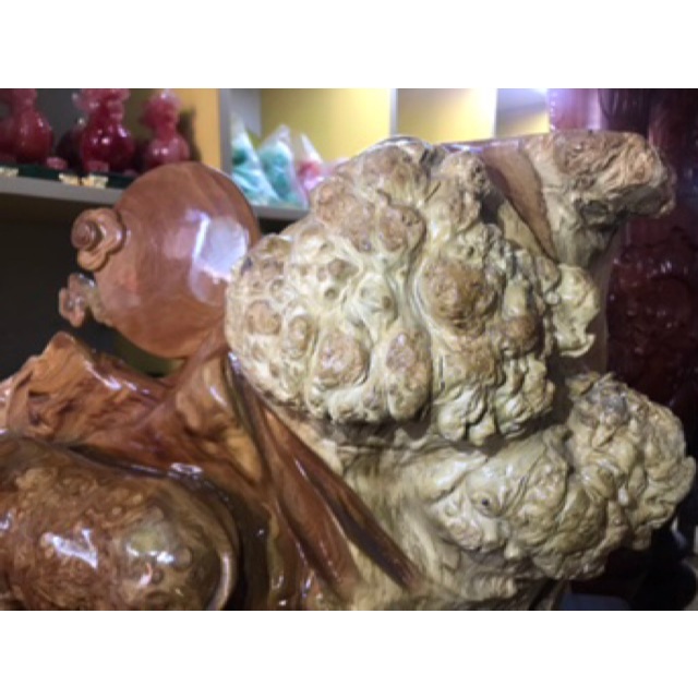 _ Tượng phật di lặc gánh cành đào được làm bằng chất liệu gỗ huyết long liền khối tự nhiên 100% _ Kt cao 20×9×6cm _ Tượng được chạm khắc gọt tỉa vô cùng tỉ