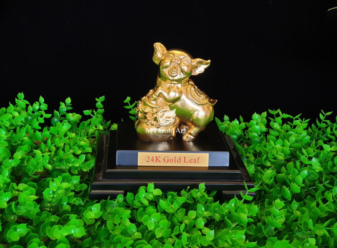 Tượng heo dát vàng 24k là sản phẩm quà tết độc đáo, sang trọng, ý nghĩa. Với hình ảnh chú lợn đang thong dong đi trên đống tiền là biểu trưng cho một năm mới nhiều tiền tài, may mắn, cuộc sống an nhiên. Chú heo là biểu tượng của tuổi hợi và được gọi là con lợn vàng mang đến may mắn, tài lộc. Tượng heo dát vàng 24k là món quà tết sang trọng, ý nghĩa tặng khách hàng, bố mẹ…