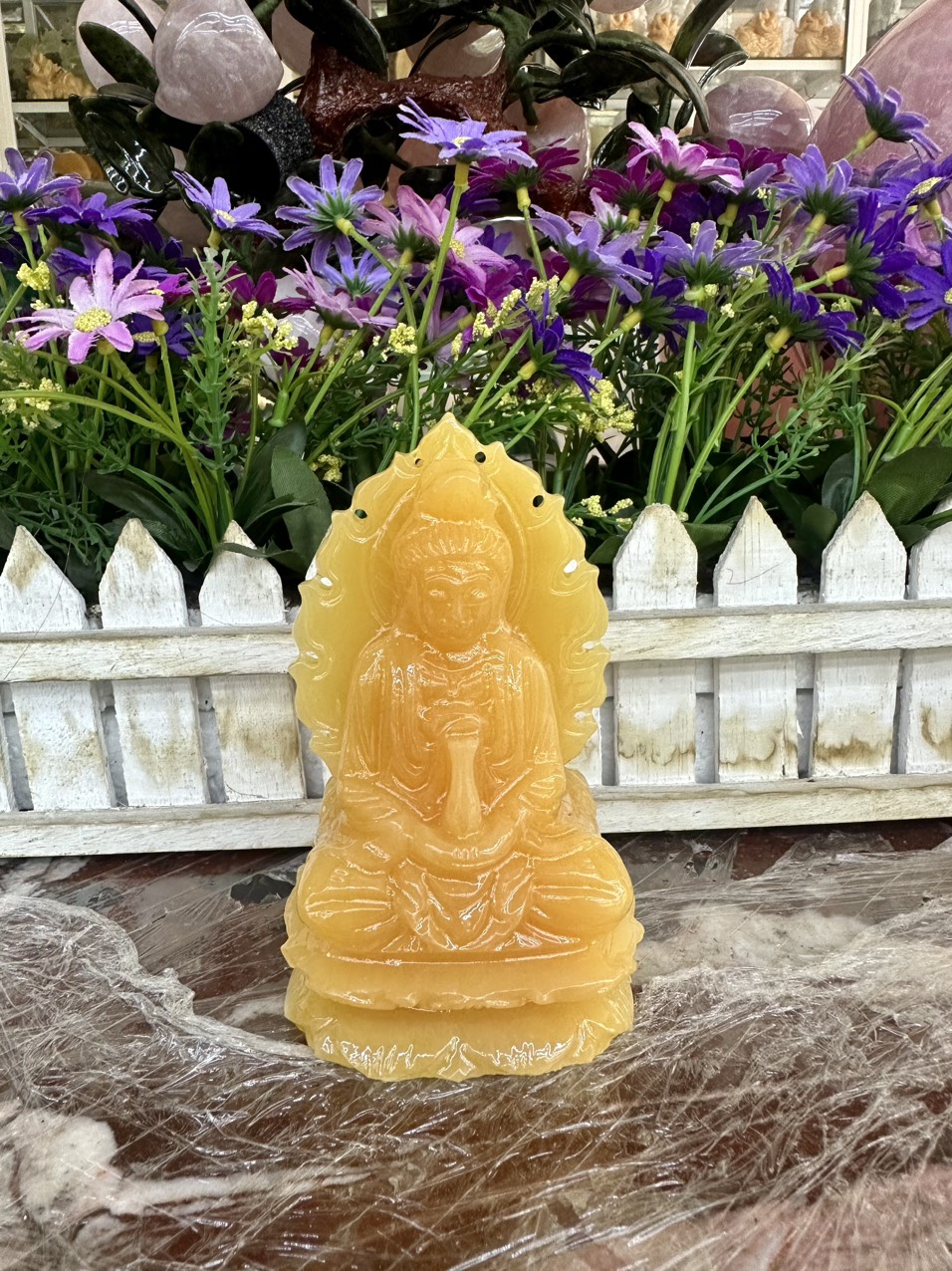Tượng Phật Quan Âm Đá Lưu Ly Vàng Mới để trong xe hơi hoặc để bàn cao 12cm đk 7cm đế 5cm Mệnh Kim mệnh Thổ mệnh Thủy ạ *** Tượng Phật Quan Âm Đá