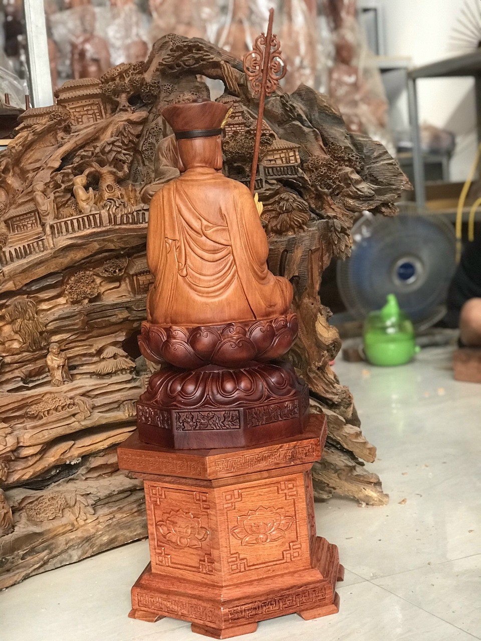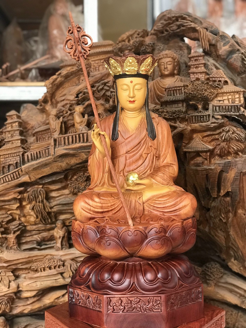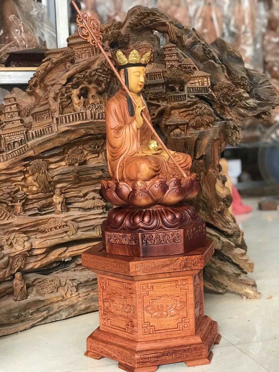 _ Tượng phật địa tạng vương bồ tát được làm bằng chất liệu gỗ hương đá liền khối tô làm mầu giả cổ _ Kích thước 50×25×25cm _ Tượng phật địa tạng vương bồ tát
