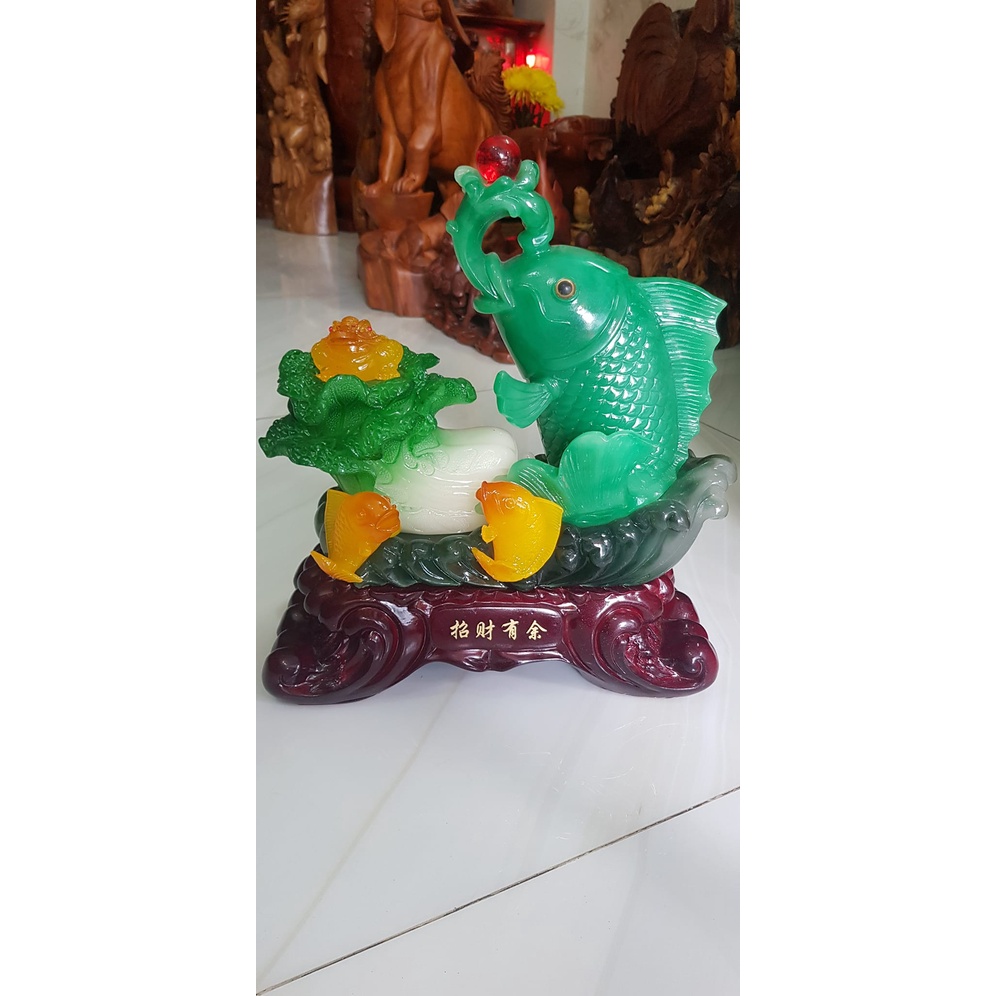 Tượng Cá Chép Xanh To Ngậm Châu Đỏ Bắp Cải Có Cá có nước có tiền Bắp cải Size 39cm x 33cm x 17cm