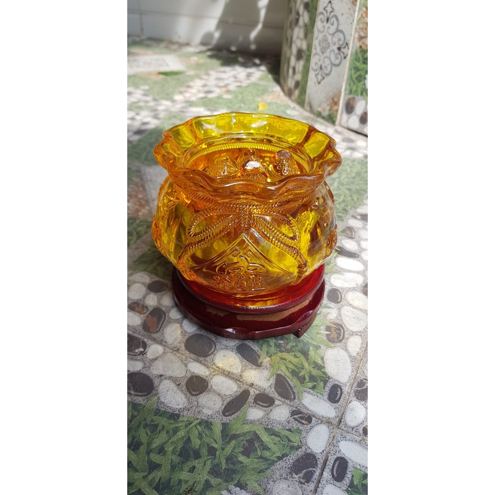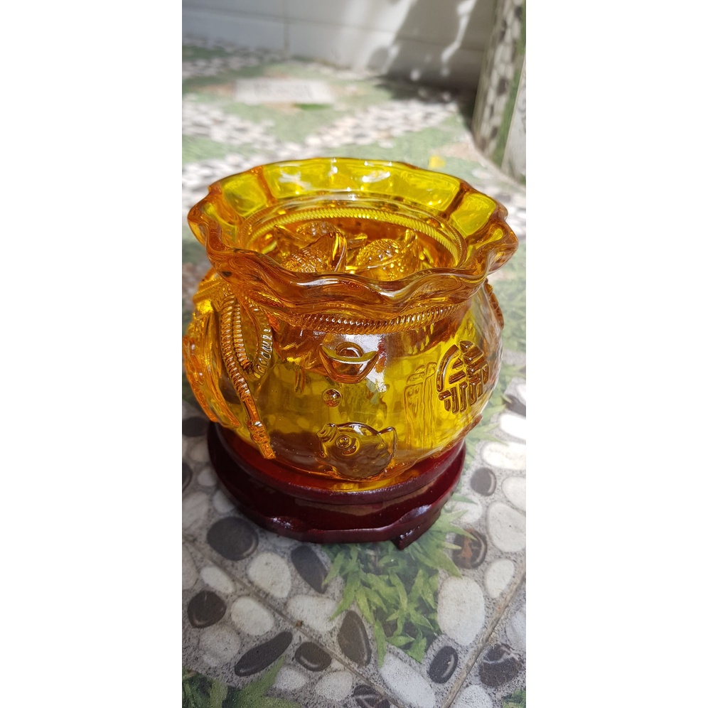 Thố tụ tài to mới miệng kiểu màu vàng anh tài lộc 20 thỏi xiền vàng đá lưu ly tự nhiên đế gỗ Size lớn đk 13cm x Cao 13cm cả đế x thố cao 9cm