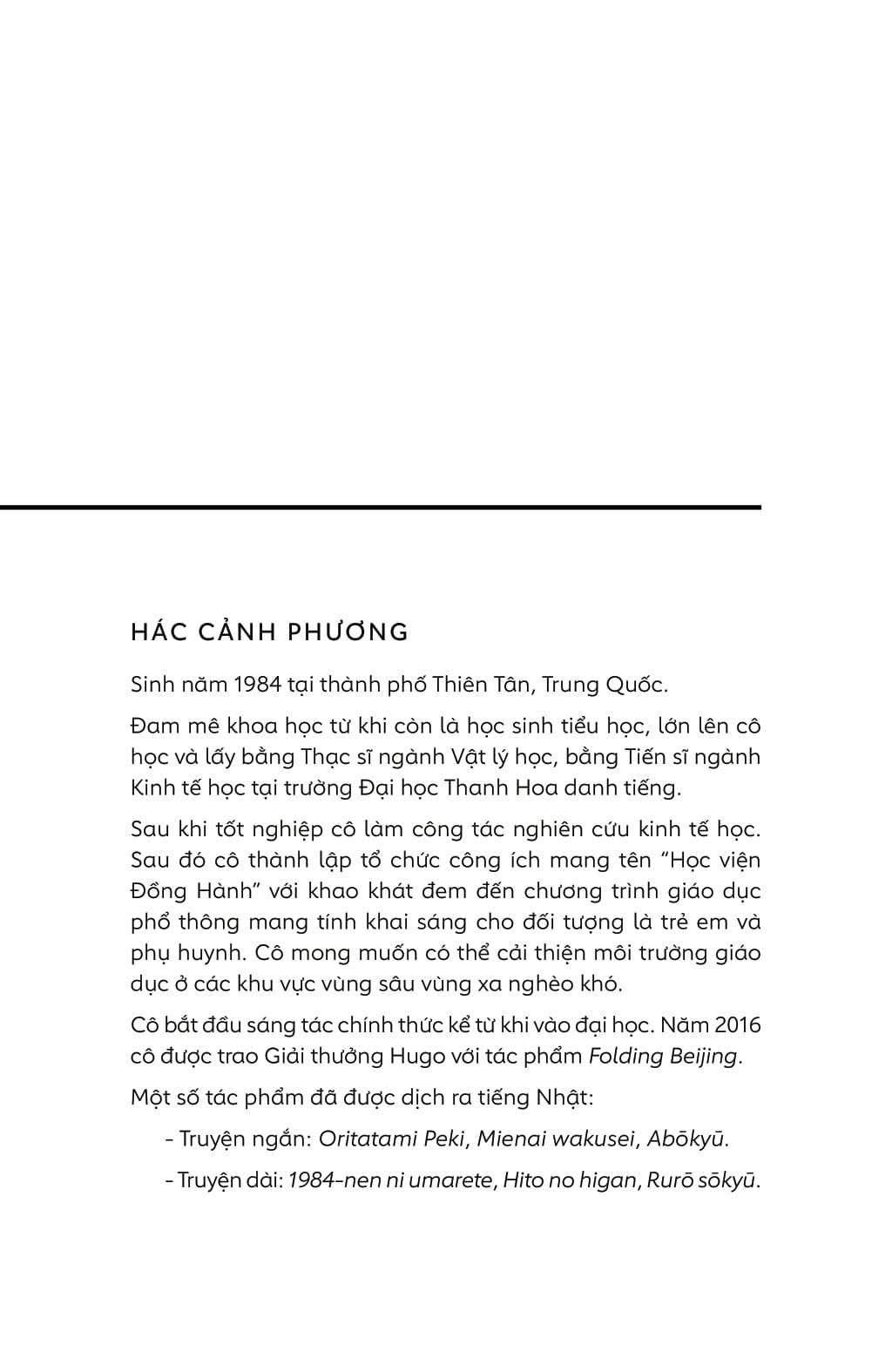 Hác Cảnh Phương, nữ nhà văn khoa học viễn tưởng người Trung Quốc. Năm 2016, cô được trao Giải Hugo (giải thưởng quốc tế dành cho các tiểu thuyết, truyện ngắn và các công trình khác thuộc thể loại khoa học viễn tưởng, thành lập từ năm 1953) cho tác phẩm “Folding Beijing”.