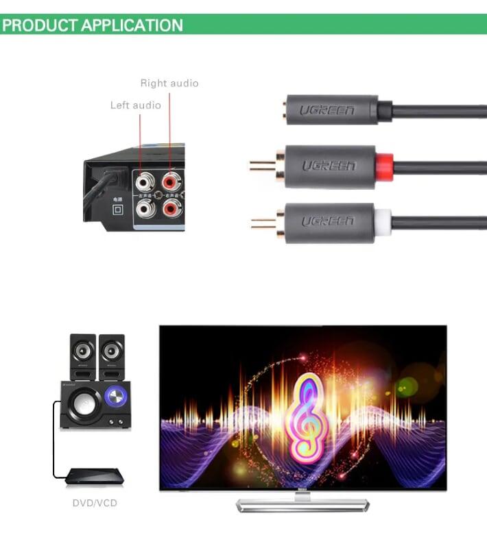 - Cáp Chuyển Đổi Ugreen 3.5mm Sang 2 RCA 10511 (1.5m) được dùng để kết nối từ điện thoại, máy tính, máy nghe nhạc… đến các thiết bị âm thanh có chuẩn RCA (hoa sen)