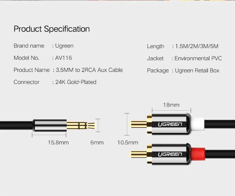 Ugreen 10591 3.5Mm Male To 2Rca Male Cable 5M 1. Features: 3.5mm to 2 RCA audio converter cable 2. Length: 5M 3. Color: Black 4. Input: 3.5mm audio jack (AUX) 5. Output: 2 RCA L