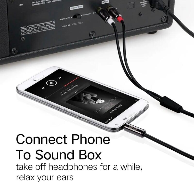UGREEN AV102 cáp chuyển jack 3.5mm Stereo sang 2 cổng hoa sen RCA. Cáp sử dụng để kết nối điện thoại, thiết bị nghe nhạc IPod, MP3 player, máy tính bảng hoặc máy tính đến