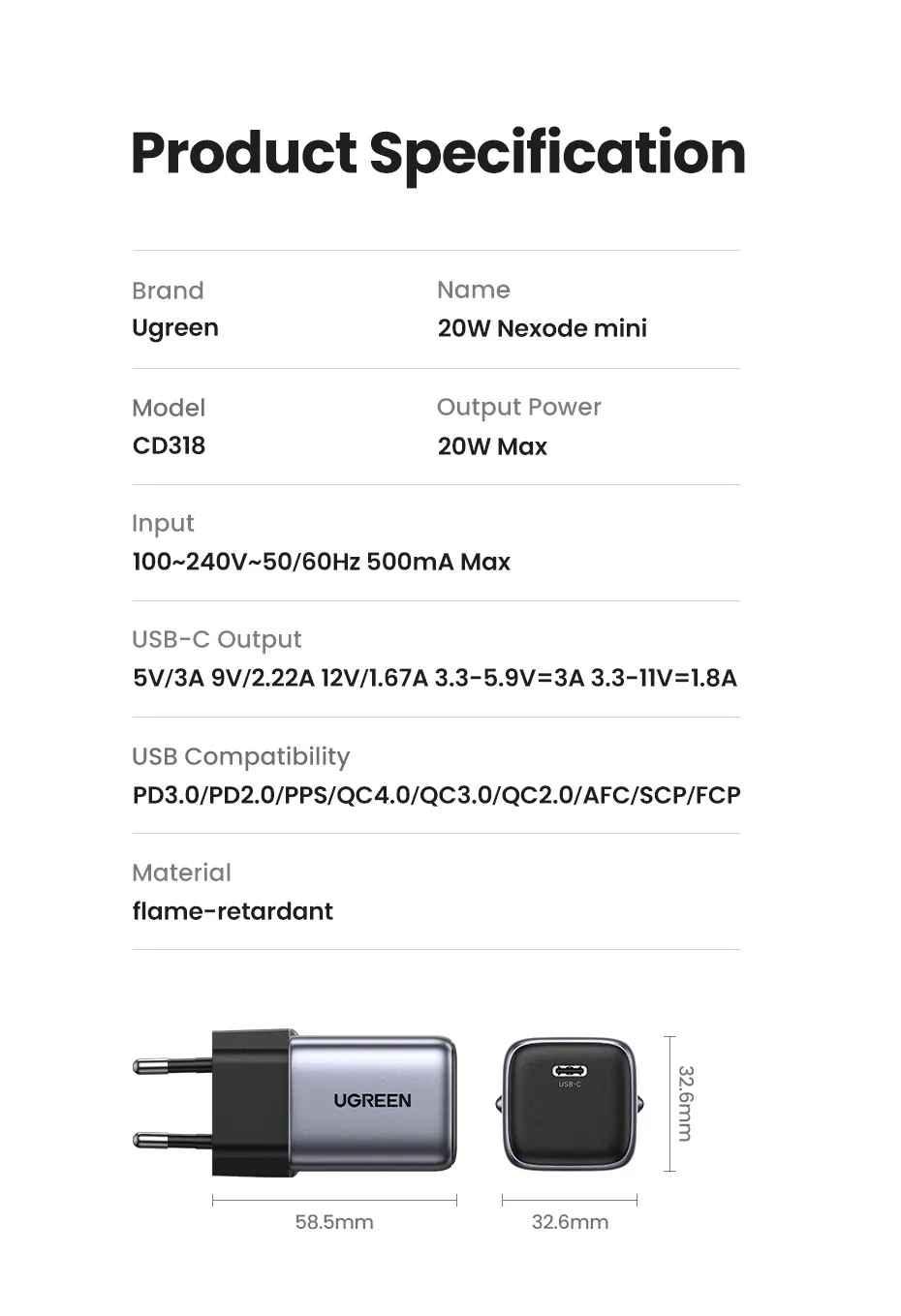 Ugreen 40715 Qc3.0 + Qc3.0 36W Dual Fcp Usb Charger Quick Charge White CD161 1. Input: 100-240V ~ 50 / 60Hz 1.2A 2. Max 2xQuick Charge 3.0 Output: 5V / 3A 9V / 2A 12V