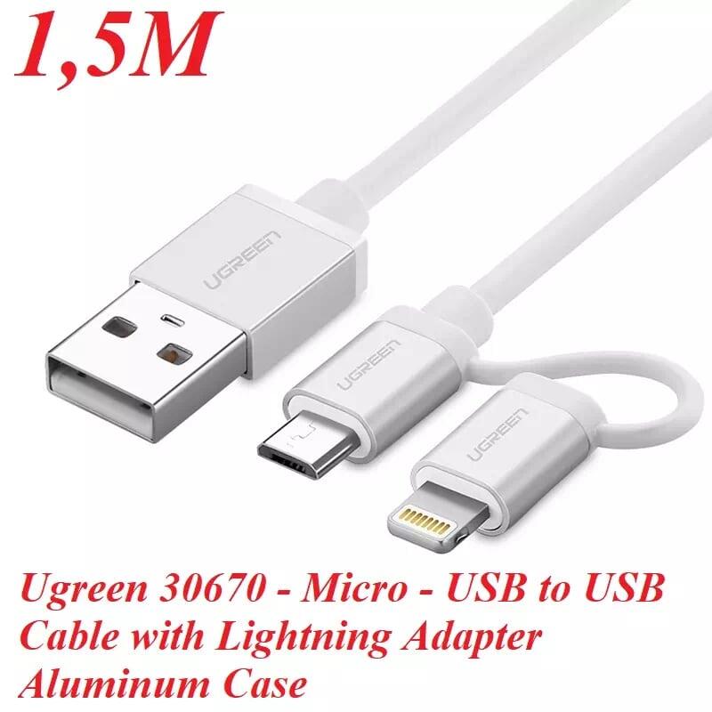 Ugreen 30670 1.5M Micro USB to USB cable cáp with Lightning Adapter Aluminum Case US165 1. Function: Charging + Data transmission 2. Length: 1.5M 3. Color: Silver 4. Type: Micro USB, Lightning 5. Current: 5V