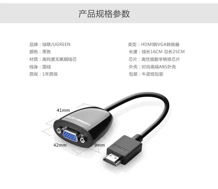 Ugreen 40248 Hdmi To Vga + 3.5Mm Audio + Mirco Usb Converter Flat Design Đen Mm103 1. Features: connect HDMI port device to monitor, projector with VGA port. 2. Cable length: 15CM 3. Wire form: