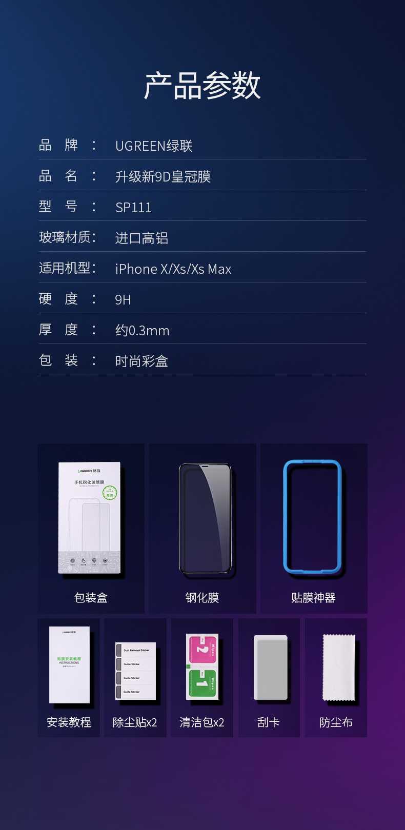 Ugreen 50953 3D Full Coverage HD Screen Protector SP111 1. 3D Full cover HD 2. For iPhone X + Xs 5.8 Inch 3. Hardness : 9H 4. Thickness : 0.3mm 5. Soft Edges : 3D