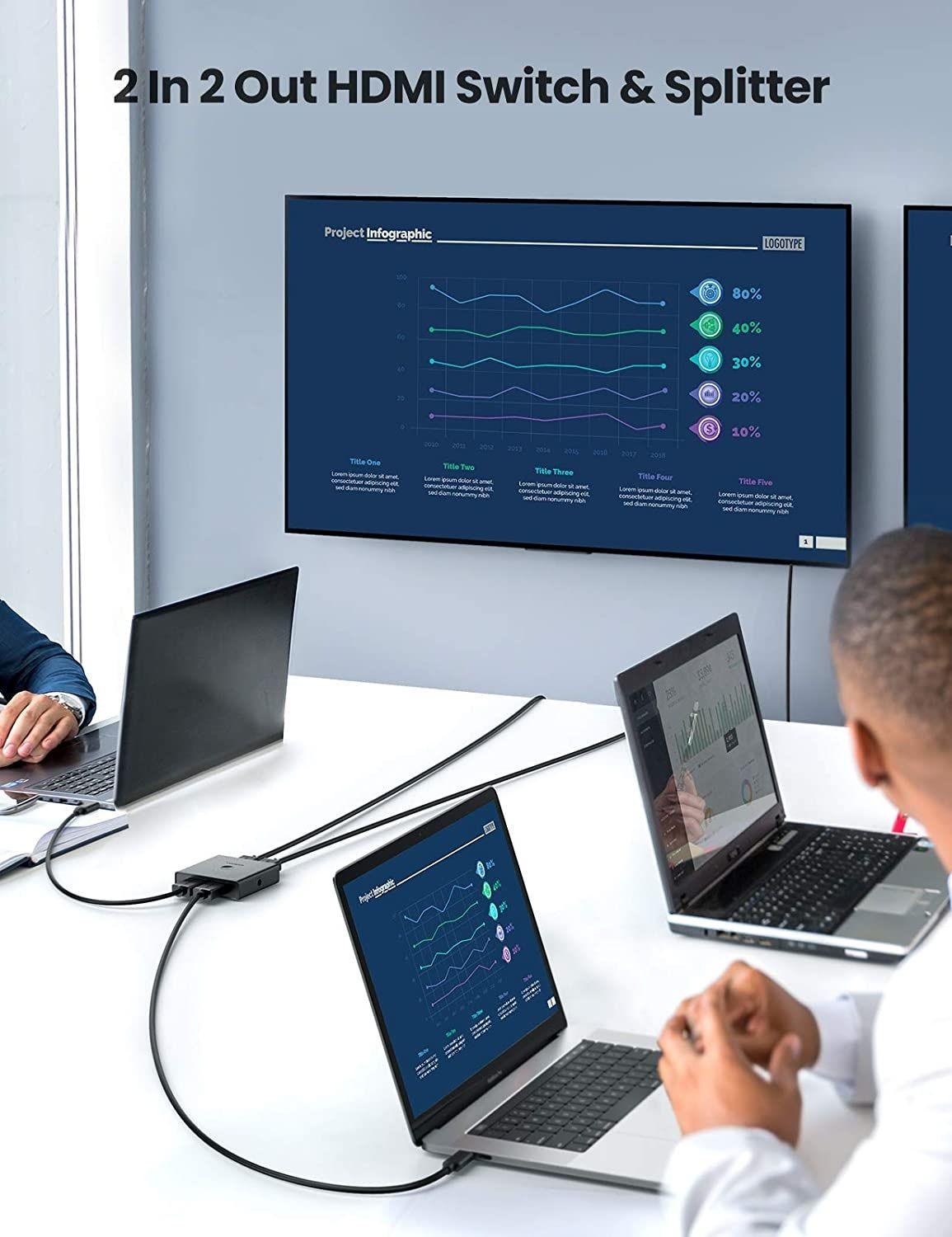 1. This UGREEN 2 IN 2 OUT HDMI Signal switch box offers easy way for you to connect 2 different devices such as PS5, PS4, PC and laptop with two monitors for video output, saves