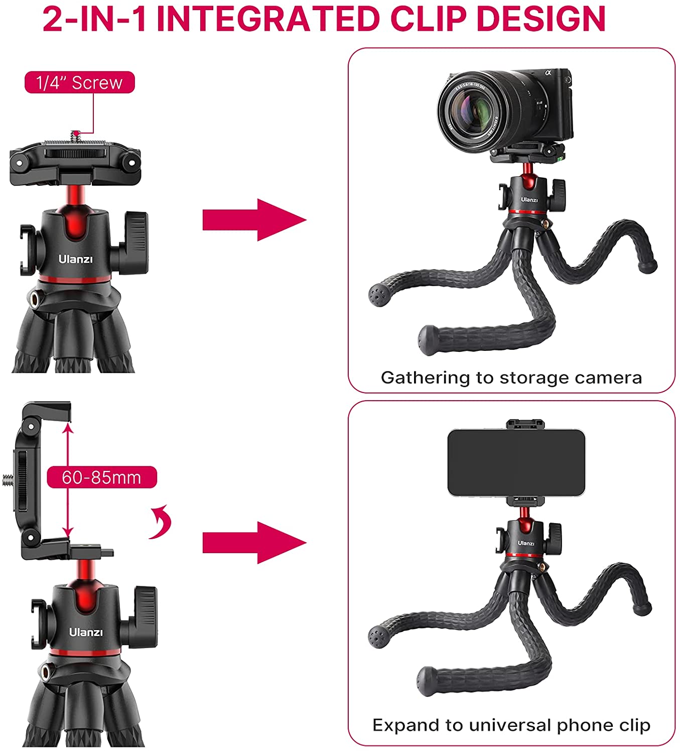ULANZI MT-33 - HÀNG CHÍNH HÃNG - Chân Tripod bạch tuộc dành cho Máy ảnh & Điện thoại, Ballhead xoay 360° TÍNH NĂNG: - Thiết kế giá đỡ điện thoại hai trong một, giá đỡ