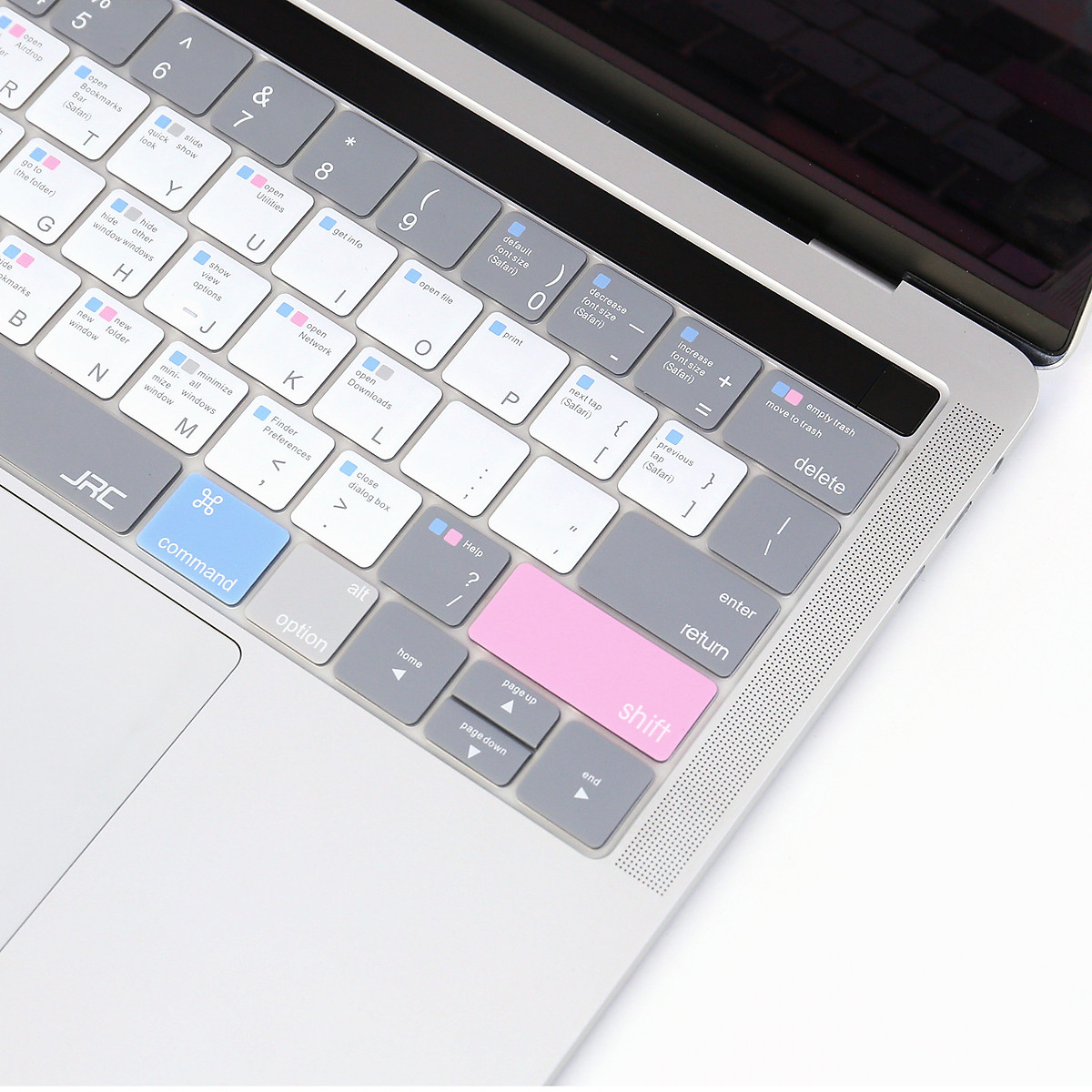 - Kết hợp màu sắc trẻ trung, với cách bố trí các tone màu tương thích phím tắt giúp bạn làm chủ được hệ điều hành Mac một cách nhanh nhất Sản phẩm chính hãng JRC Phủ phím hướng dẫn dùng phím tắt 1 cách dễ dàng, trực quan nhất có thể, ví dụ Command+C ( trên phím sẽ hiển thị cách bấm: Xanh (Command)+C= Cop