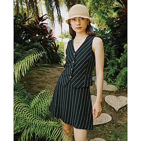 - Họa tiết sọc kinh điển: Họa tiết sọc dọc mảnh trên nền vải đen không chỉ tạo hiệu ứng thị giác thon gọn mà còn là một chi tiết đặc trưng của thời trang retro, mang đến vẻ ngoài cá tính, không bao giờ lỗi mốt và dễ dàng gợi nhớ đến những biểu tượng phong cách xưa. Họa tiết này tiếp tục được sử dụng đồng bộ trên cả áo gile và chân váy, tạo nên một tổng thể hài hòa, đậm chất vintage.