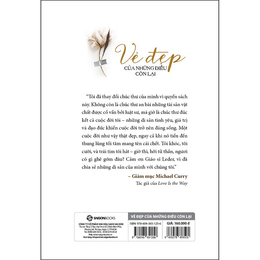 Quyển sách “Vẻ đẹp của những điều còn lại” do tác giả Steve Leder viết, ông là một giáo sĩ người Do Thái và đã chủ trì hơn 1000 tang lễ trong suốt 3 thập kỷ. Cuốn sách khuyến khích chúng ta đối mặt với cảm xúc của mình về cái chết, nhắc nhở chúng ta không sợ hãi sự kết thúc của sự sống mà hãy nắm bắt những gì nó có thể dạy ta khi ta còn nơi đây. Những câu chuyện và trải nghiệm của tác giả được ông truyền tải một cách tinh tế, khiến bạn có cảm giác như thể đang nói chuyện với một người bạn thân.
