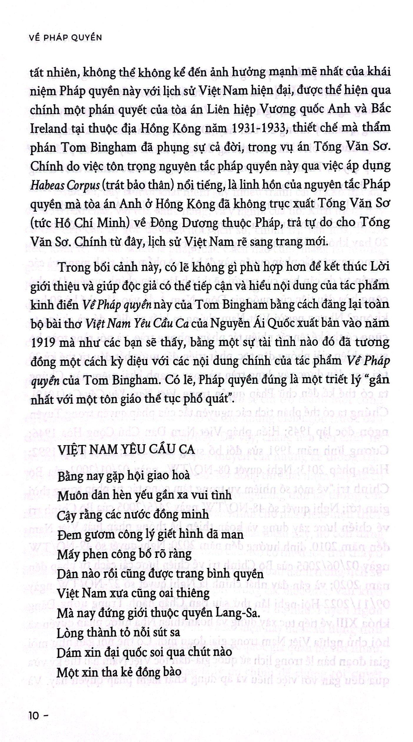 - Phần ba (Chương 11-12) thảo luận về những căng thẳng đối với pháp quyền từ chủ nghĩa khủng bố và nguyên tắc c.hủ quyền nghị viện (Anh). Pháp quyền là nền tảng của xã hội văn minh. Và theo lời tác giả “trong một thế giới bị chia rẽ bởi những khác biệt về quốc tịch, c.hủng tộc, màu da, tôn giáo và của cải, pháp quyền là một trong những yếu tố vĩ đại nhất (và có thể chính là yếu tố vĩ đại nhất) giúp chúng ta đoàn kết lại”. Có thể thấy pháp quyền, luật pháp là những tri thức căn bản cần có với mỗi công dân trong xã hội, chứ không chỉ riêng ai làm trong ngành Luật. VỀ TÁC GIẢ Tom Bingham (1933 – 2010) là người duy nhất từng đảm nhiệm 3 vị trí: Phụ trách phòng Dân sự thuộc Tòa phúc thẩm Anh và xứ Wales, Chánh án Tòa án Hoàng gia Tư pháp Anh và xứ Wales, Thượng nghị sĩ tối cao phụ trách vấn đề Pháp luật của Vương quốc Anh. Sauk hi nghỉ hưu năm 2008, ông tập trung giảng dạy, viết và diễn thuyết về các chủ đề pháp lý, đặc biệt là pháp luật về nhân quyền. Trung tâm Pháp quyền Bingham (Bingham Centre for the Rule of Law) ở Anh được đặt theo tên ông.