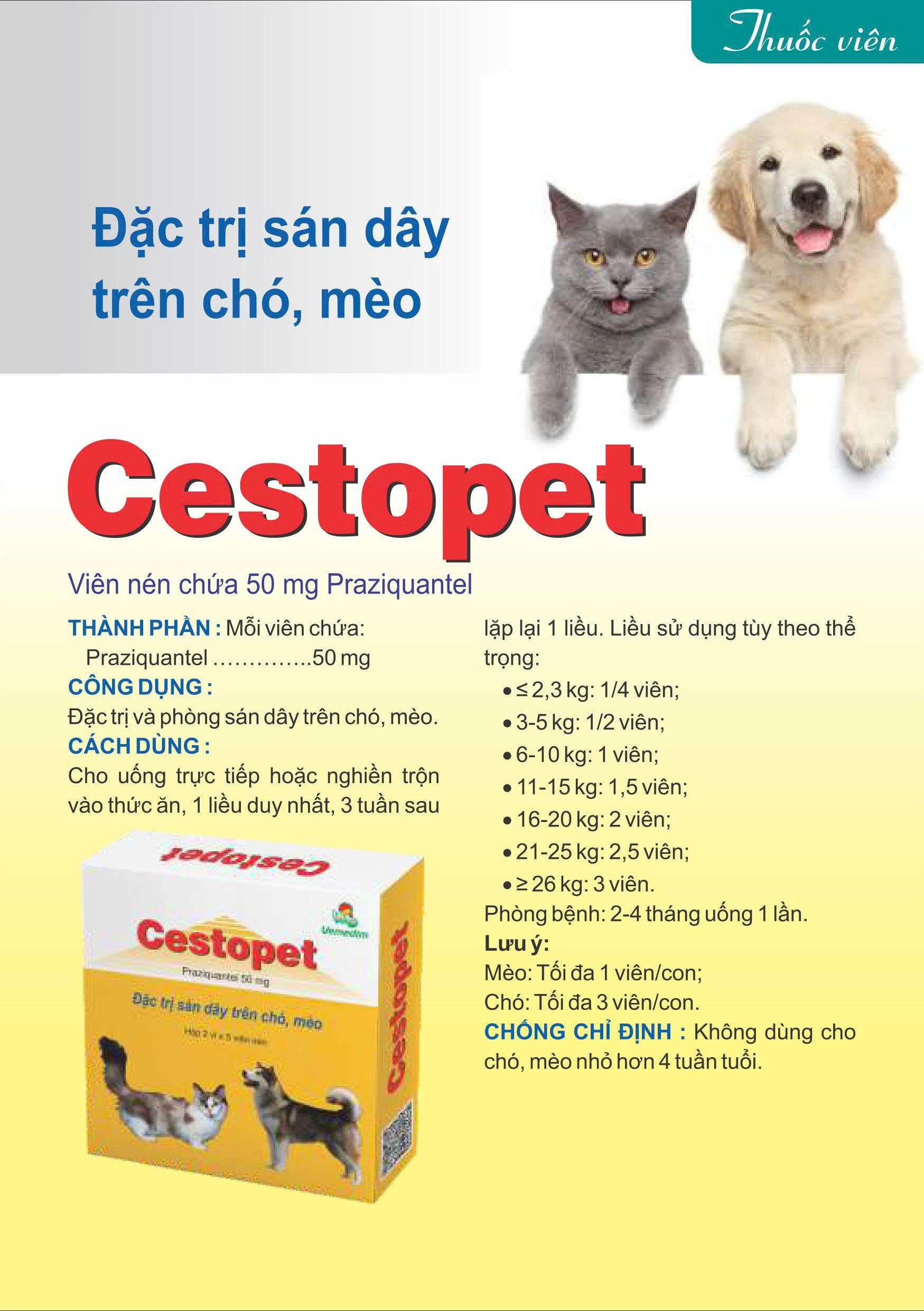 Mua tại TiktokVemedim Cestopet viên uống ngăn chặn sán dây trên chó mèo, hộp 10 viên THÀNH PHẦN: Praziquantel 50 mg CÔNG DỤNG: Loại bỏ và ngăn ngừa sán dây trên chó, mèo. LIỀU DÙNG: Cho uống trực tiếp hoặc nghiền trộn vào thức ăn, 1 liều duy nhất, 3 tuần sau lặp lại 1 liều. Liều sử dụng tùy theo thể trọng: ≤ 2,3 kg: 1/4 viên; 3-5 kg: 1/2 viên; 6-10 kg: 1 viên; 11-15 kg: 1,5 viên; 16-20 kg: 2 viên; 21-25 kg: 2,5 viên; ≥ 26 kg: 3 viên. Phòng ngừa: 2-4 tháng uống 1 lần. Lưu ý: Mèo: Tối đa 1 viên/con; Chó: Tối đa 3 viên/con. Chống chỉ định: Không dùng cho chó, mèo nhỏ hơn 4 tuần tuổi. BẢO QUẢN: Nơi khô mát, tránh ánh nắng trực tiếp.