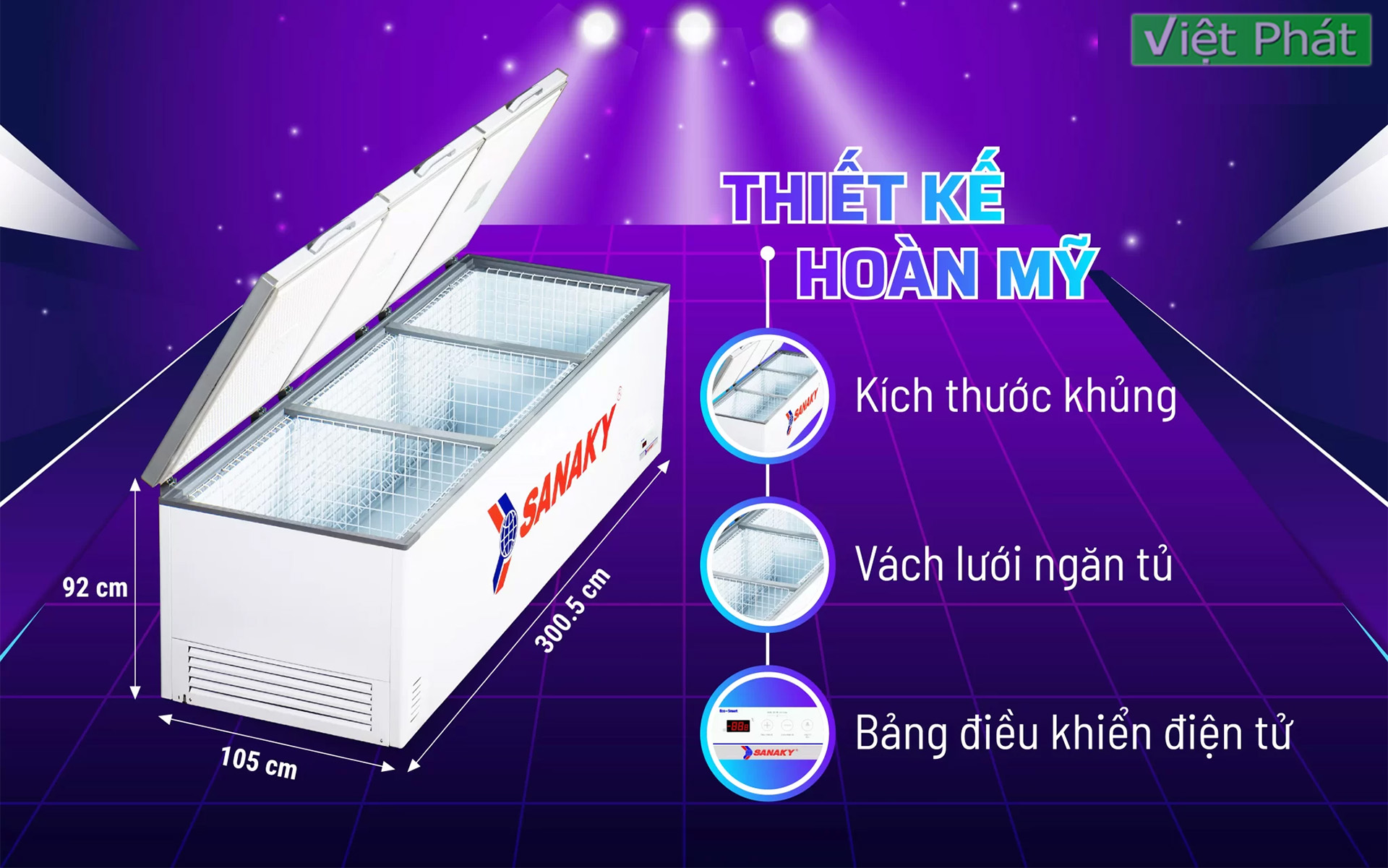 Kích thước Tủ đông Sanaky VH-1799HY3 với 3 chiều dài x rộng x cao là 3005 x 1050 x 920 dung tích 1500 lít. Sản phẩm đáp ứng được nhu cầu của các siêu thị, nhà hàng, quán ăn, căng tin cỡ lớn…có số lượng khủng thực phẩm cần tích trữ