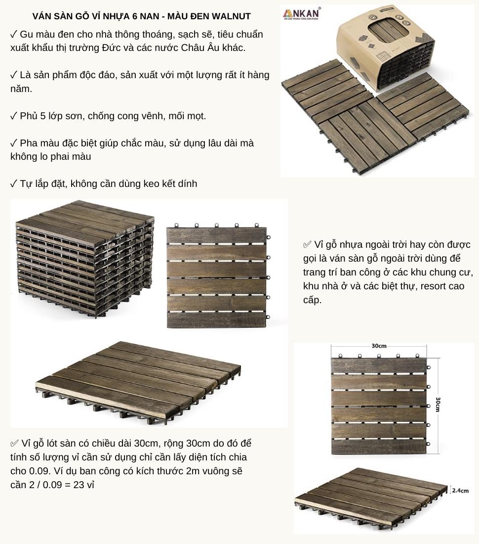 Ván sàn gỗ vỉ nhựa Màu Đen thương hiệu ANKAN đã qua nhiều công đoạn xử lý, chống cong vênh, mối mọt. Chịu nước tốt, không trơn trượt khi trời mưa, có thể đi chân không khi trời nắng.