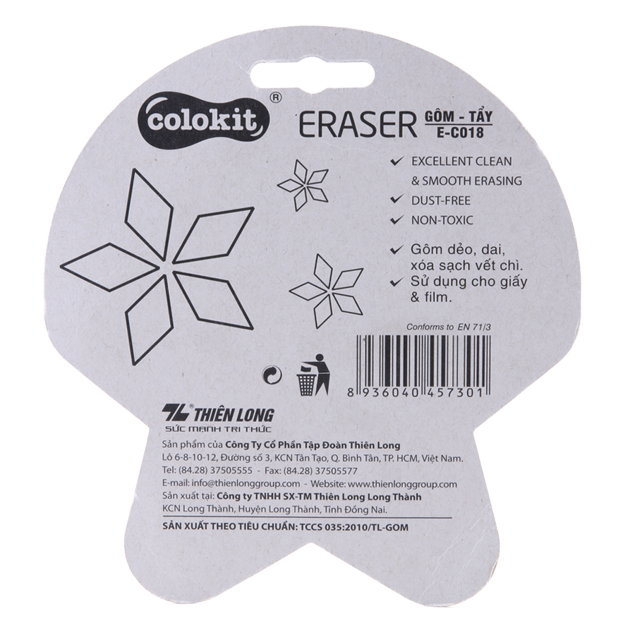 - Thương hiệu: Thiên Long - Xuất xứ: Việt Nam - Quy cách: 30 gôm/ hộp - Màu sắc: xanh - trắng, lá - trắng , đỏ - trắng - Gôm Điểm 10 TP-E022 có