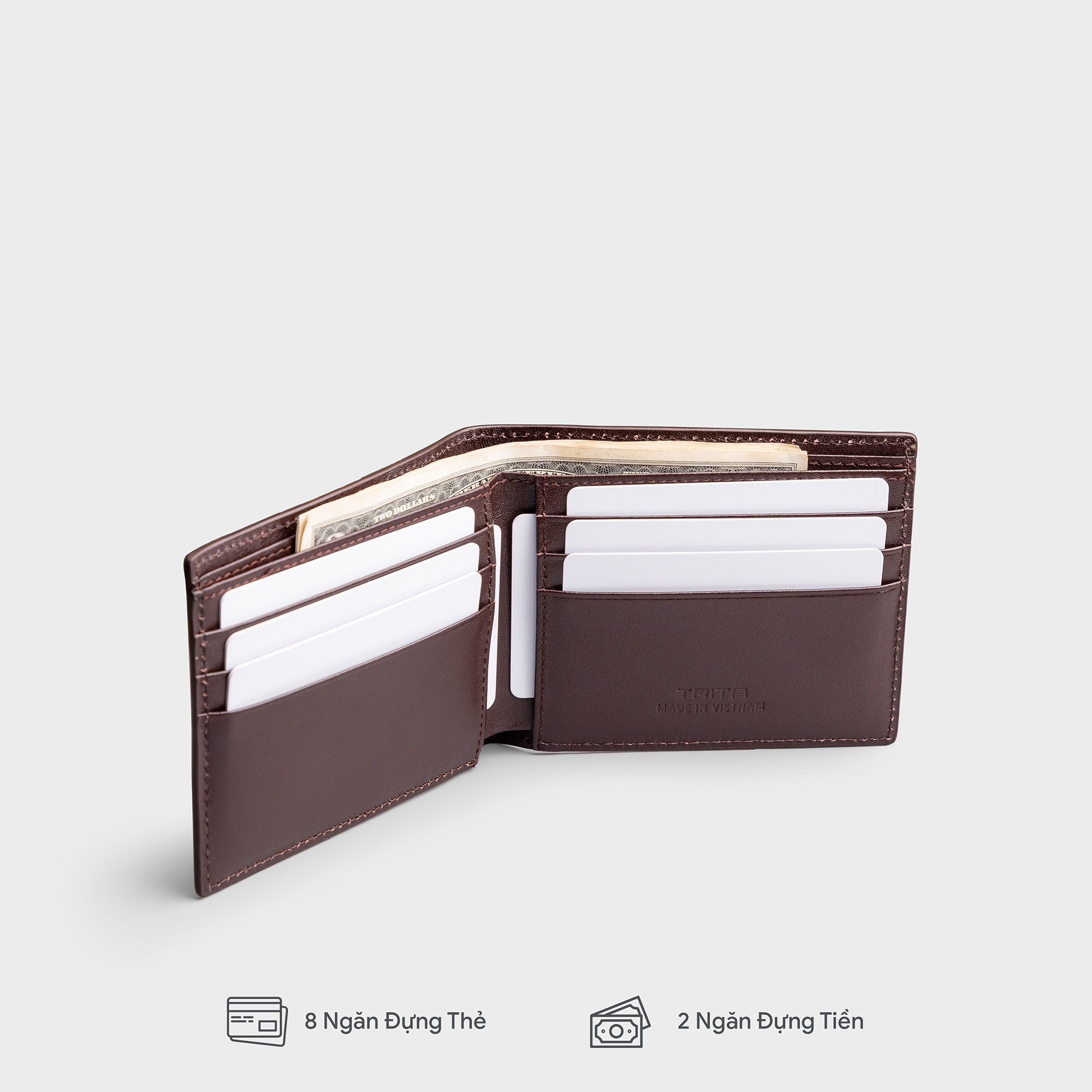 Ví da nam dáng ngang Trita RVN15 được làm chất liệu da bò thật cao cấp. Chất da mềm mại, đường kim, mũi chỉ chắc chắn. Logo được dập chìm bên ngoài và bên trong mang lại kiểu dáng sang trọng cho chiếc ví. Bên trong được thiết kế ngăn cơ bản phù hợp với mọi nhu cầu thường ngày. Sản phẩm có 2 gam màu cơ bản dễ dàng phối với mọi phong cách.