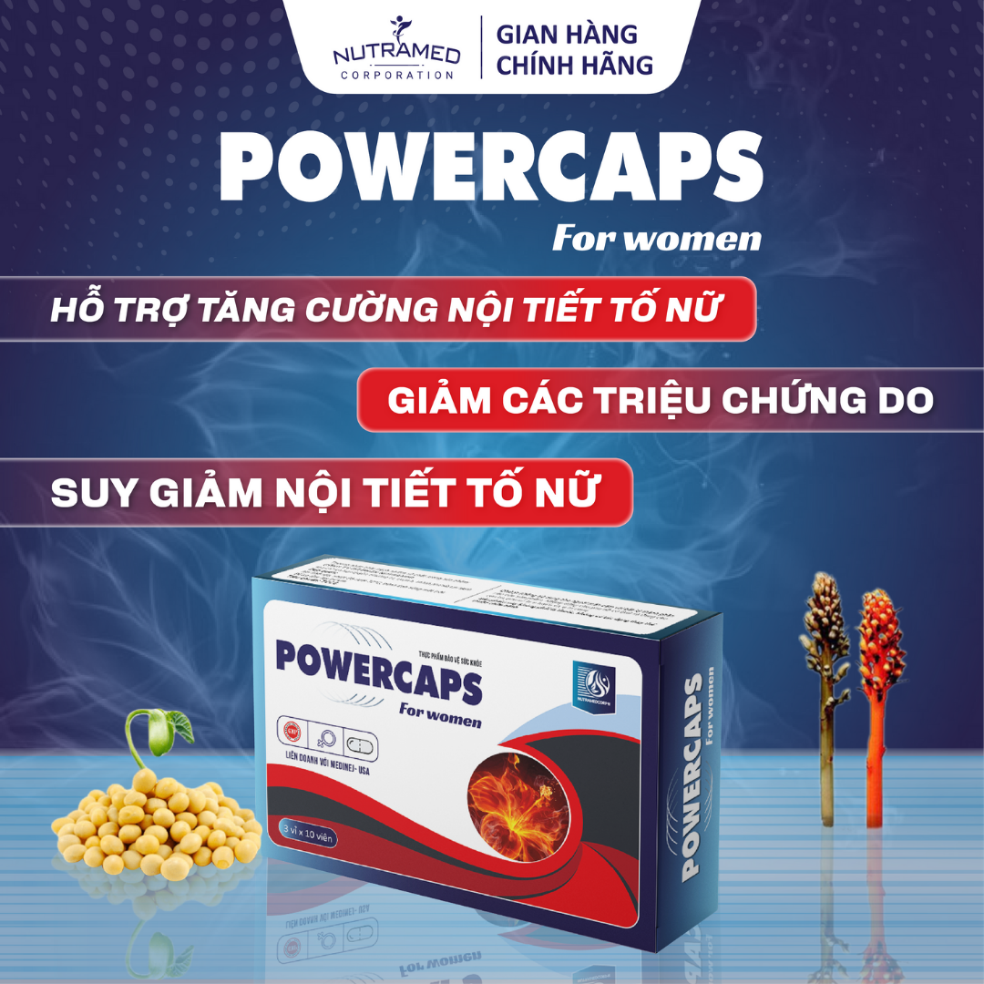 POWERCAPS FOR WOMEN - Giải pháp hỗ trợ tăng cường nội tiết tố nữ, giảm các triệu chứng do suy giảm nội tiết tố nữ   THÀNH PHẦN  ️ Chiết xuất Mầm đậu nành (Soy extract); Chiết xuất Thiên ma (Black cohosh extract); Chiết xuất cây Trinh nữ (Vitex agnus-castus extract); Chiết xuất Khoai mỡ Mexico (Dioscorea villosa extract); Chiết xuất cây Tráng dương (Turnera diffusa extract); Chiết xuất Maca (Lepidium meyenii extract)   CÔNG DỤNG    ️ Hỗ trợ tăng cường nội tiết tố nữ, giúp giảm các triệu chứng do suy giảm nội tiết tố nữ như bốc hỏa, mất ngủ, da khô sạm.   ĐỐI TƯỢNG SỬ DỤNG  ️ Phụ nữ mãn kinh, tiền mãn kinh, người bị suy giảm nội tiết tố nữ với biểu hiện: chóng mặt, mất ngủ, cơn bốc hỏa, suy giảm s.i.n.h l.ý nữ, da khô sạm.   HƯỚNG DẪN SỬ DỤNG  ️ Ngày uống 1-2 lần, mỗi lần 1 viên, uống sau khi ăn 2 giờ.   KHÔNG SỬ DỤNG TRONG TRƯỜNG HỢP  ️ Người mẫn cảm với bất kỳ thành phần nào của sản phẩm.  ️ Phụ nữ có thai và đang cho con bú.  ️ Phụ nữ bị u tuyến vú, u tử cung.   LƯU Ý  ️ Sản phẩm này không phải là thuốc, không có tác dụng thay thế thuốc chữa bệnh.   BẢO QUẢN   ️ Nơi khô ráo, nhiệt độ dưới 30°C, tránh ánh sáng mặt trời.   ️ Để xa tầm tay trẻ em.   THÔNG TIN SẢN PHẨM Tên sản phẩm: Powercaps For Women Quy cách: Hộp 30 vỉ x 10 viên Hạn sử dụng: 36 tháng  từ ngày sản xuất Tiêu chuẩn: TCCS   _ NUTRAMED - KHƠI NGUỒN KHOA HỌC TỚI CUỘC SỐNG   Nhà máy đạt chuẩn WHO – GMP. Nguyên liệu được kiểm tra chất lượng khắt khe bởi nhà máy đạt chuẩn GMP.