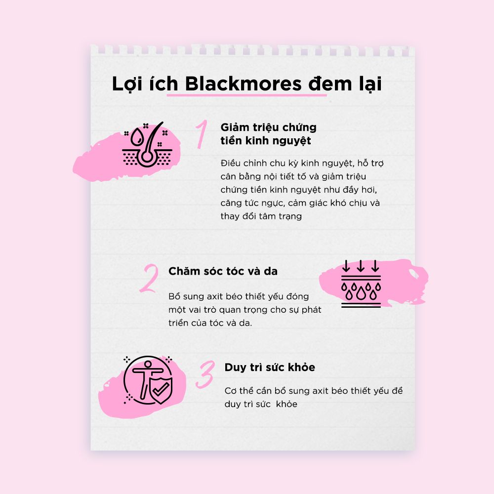 Blackmores Evening Primrose Oil là sản phẩm được chiết xuất từ hoa anh thảo, cung cấp nhiều axit béo omega-6 và một trong những nguồn tốt nhất là axit gamma-linolenic (GLA), axit này giúp cân bằng các hormone sinh sản của phụ nữ, hỗ trợ sức khỏe làn da và bảo vệ sức khỏe.