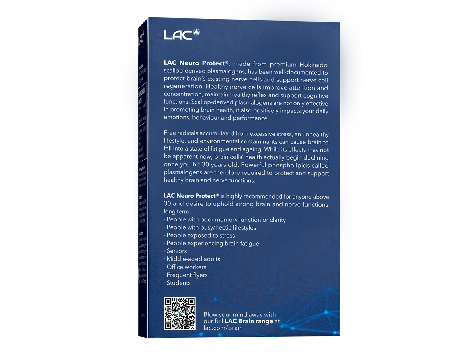 VIÊN UỐNG HỖ TRỢ BẢO VỆ HỆ THẦN KINH LAC NEURO PROTECT (30 VIÊN) là sản phẩm tái tạo trí não mạnh mẽ, được chiết xuất từ plasmalogens cao cấp từ sò điệp Hokkaido. Plasmalogens