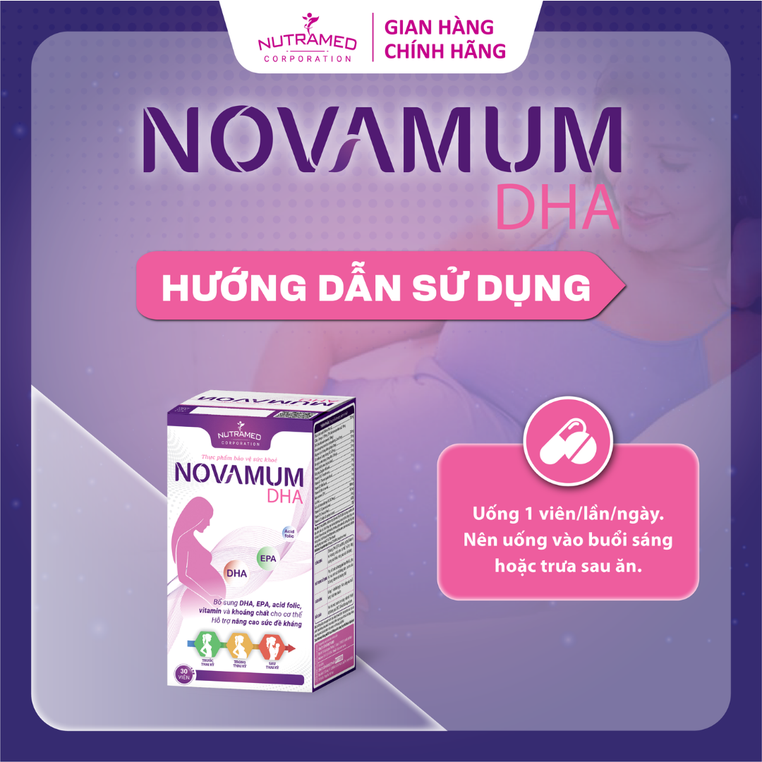 NOVAMUM DHA - Giải pháp bổ sung DHA, EPA, Acid Folic, Vitamin, Khoáng chất và hỗ trợ nâng cao sức đề kháng THÀNH PHẦN ️ Dầu cá tinh luyện, Dicalcium phosphate khan, Magnesi oxyd, Sắt carbonyl, Kẽm gluconate Vitamin B6 Bột gừng, Vitamin B5, Vitamin B1, Vitamin B2, Vitamin B3, Beta-carotene, Acid folic, Kali iodid, Vitamin B12, Vitamin D3, Vitamin E (DL-alpha tocopheryl)   CÔNG DỤNG ️ Bổ sung DHA, EPA, acid folic, một số vitamin và khoáng chất cho cơ thể, hỗ trợ nâng cao sức đề kháng.   ĐỐI TƯỢNG SỬ DỤNG ️ Phụ nữ trước và trong giai đoạn thai kỳ, phụ nữ sau sinh sức đề kháng kém, có nhu cầu bổ sung vitamin và khoáng chất.     HƯỚNG DẪN SỬ DỤNG ️ Uống 1 viên/lần/ngày. Nên uống vào buổi sáng hoặc trưa sau ăn.   KHÔNG SỬ DỤNG TRONG TRƯỜNG HỢP ️ Người mẫn cảm, kiêng kỵ với bất kỳ thành phần nào của sản phẩm.   LƯU Ý ️ Không dùng chung với các sản phẩm chứa vitamin và khoáng chất khác.  ️ Người đang dùng thuốc tham khảo ý kiến chuyên gia y tế trước khi dùng.  ️ Thực phẩm này không phải là thuốc, không có tác dụng thay thế thuốc chữa bệnh.   BẢO QUẢN  ️ Nơi khô mát, nhiệt độ không quá 30∘C, tránh ánh sáng mặt trời. Để xa tầm tay trẻ em.   THÔNG TIN SẢN PHẨM Tên sản phẩm: NOVAMUM DHA Quy cách: Hộp 3 vỉ x 10 viên Hạn sử dụng: 36 tháng Tiêu chuẩn: TCCS   _ NUTRAMED - KHƠI NGUỒN KHOA HỌC TỚI CUỘC SỐNG   Nhà máy đạt chuẩn WHO – GMP. Nguyên liệu được kiểm tra chất lượng khắt khe bởi nhà máy đạt chuẩn GMP.