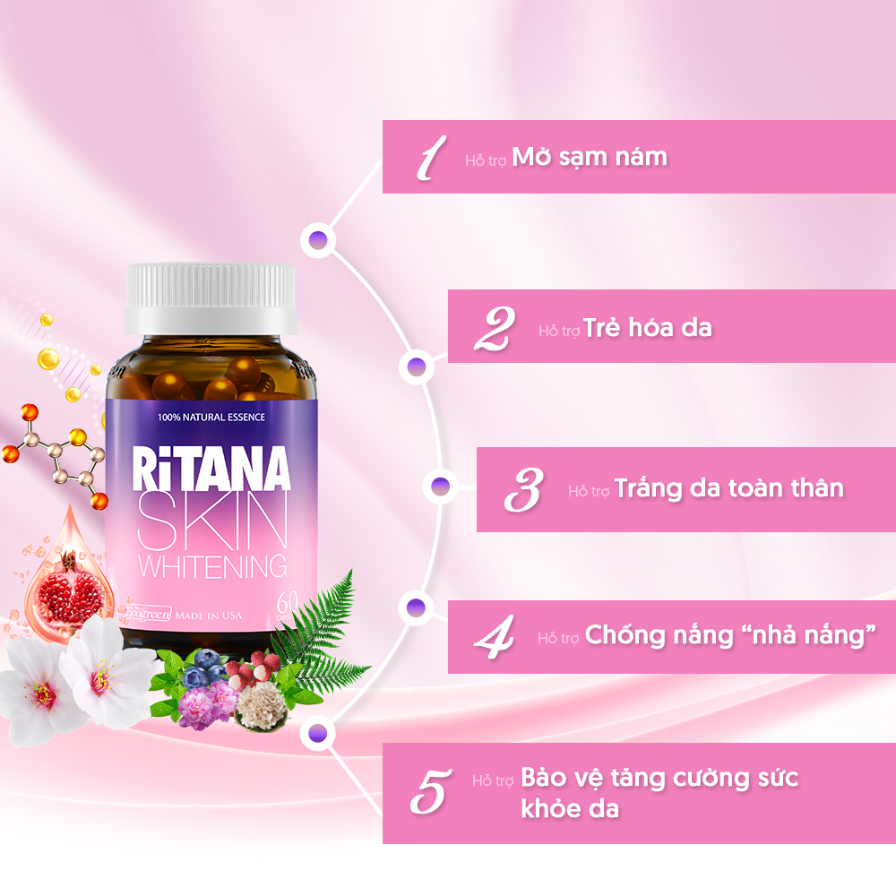 Công thức độc đáo của viên uống trắng da RiTANA chính là sự kết hợp những tính năng làm đẹp ưu việt từ các tinh chất thiên nhiên quý tác động đến tế bào giúp hỗ trợ: