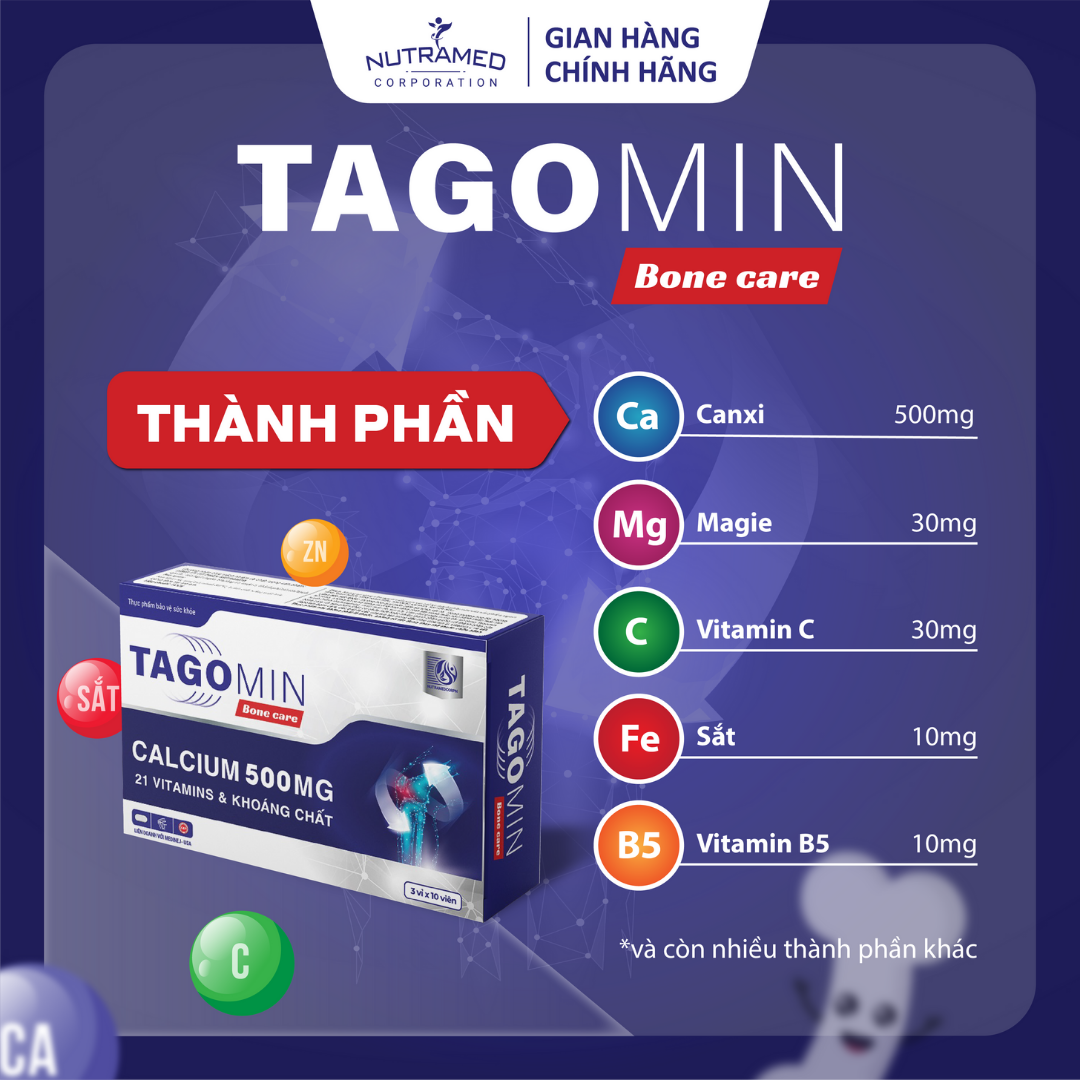 TAGOMIN - HỖ TRỢ XƯƠNG CHẮC KHỎE. CẢI THIỆN TÌNH TRẠNG CÒI XƯƠNG. GIẢM NGUY CƠ LOÃNG XƯƠNG THÀNH PHẦN ️Canxi (Calcium carbonate), Magie (Magnesium oxide), Vitamin C (Ascorbic acid), Sắt (sắt carbonyl), Vitamin B5