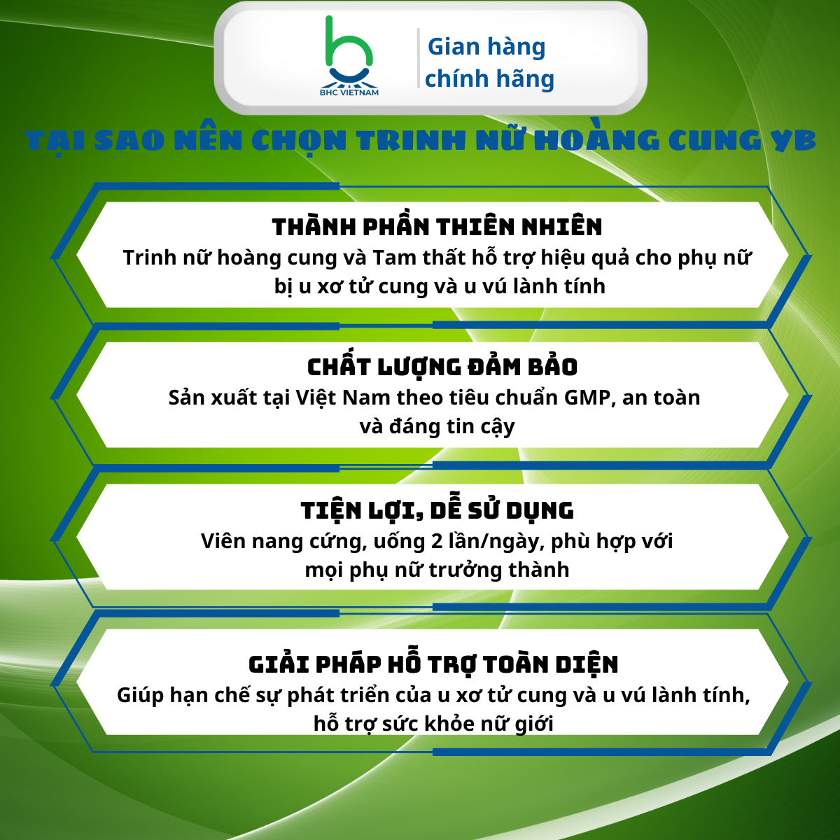 Tại sao chọn TRINH NỮ HOÀNG CUNG YB? • Thành phần từ thảo dược thiên nhiên, an toàn cho sức khỏe. • Sản xuất tại Việt Nam với tiêu chuẩn GMP, đảm bảo chất lượng. • Đặc biệt dành cho phụ nữ có vấn đề về u xơ tử cung và u vú lành tính, hỗ trợ hiệu quả.