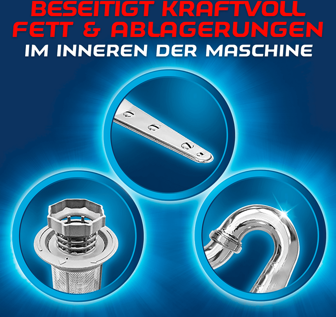 Nước cứng và cặn thức ăn lắng xuống các đường ống và các bộ phận của máy rửa chén, làm giảm hiệu quả của nó và tỏa ra mùi khó chịu. Máy rửa chén hoạt động hiệu quả hoàn toàn nếu bạn sử dụng Viên vệ sinh máy rửa bát Finish ít nhất mỗi tháng một lần. Nhờ Viên vệ sinh Finish, máy rửa chén của bạn sẽ giữ vệ sinh sạch sẽ và hoạt động lâu hơn. Viên vệ sinh Finish làm sạch những nơi khó tiếp cận, chẳng hạn như cánh tay phun, lò sưởi và bộ lọc.