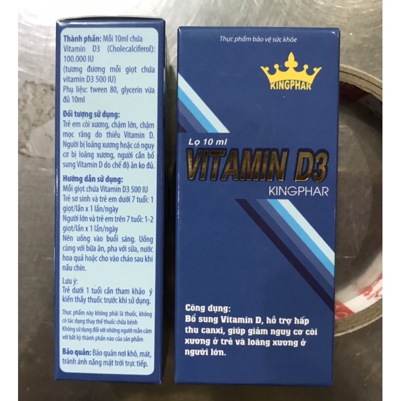 - THÀNH PHẦN Mỗi 10ml có chứa thành phần chính là: Vitamin D3 (Cholecalciferol): 100.000 IU (Tương Đương Mỗi Giọt Chứa Vitamin D3 500IU) Phụ liệu: tween 80, glycerin vừa đủ 10ml.