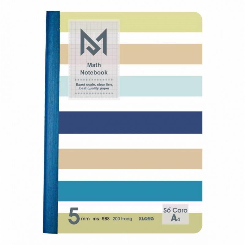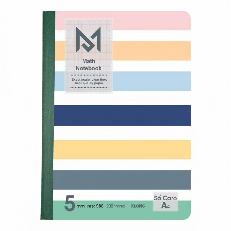 Vở Caro may dán gáy KLONG A4 200 trang 70/76; MS: 988 - Kích cỡ ô caro nét liền: 5x5mm - Định lượng: 70 g/m2 - Độ trắng: 76% ISO - Kích thước: (210 x
