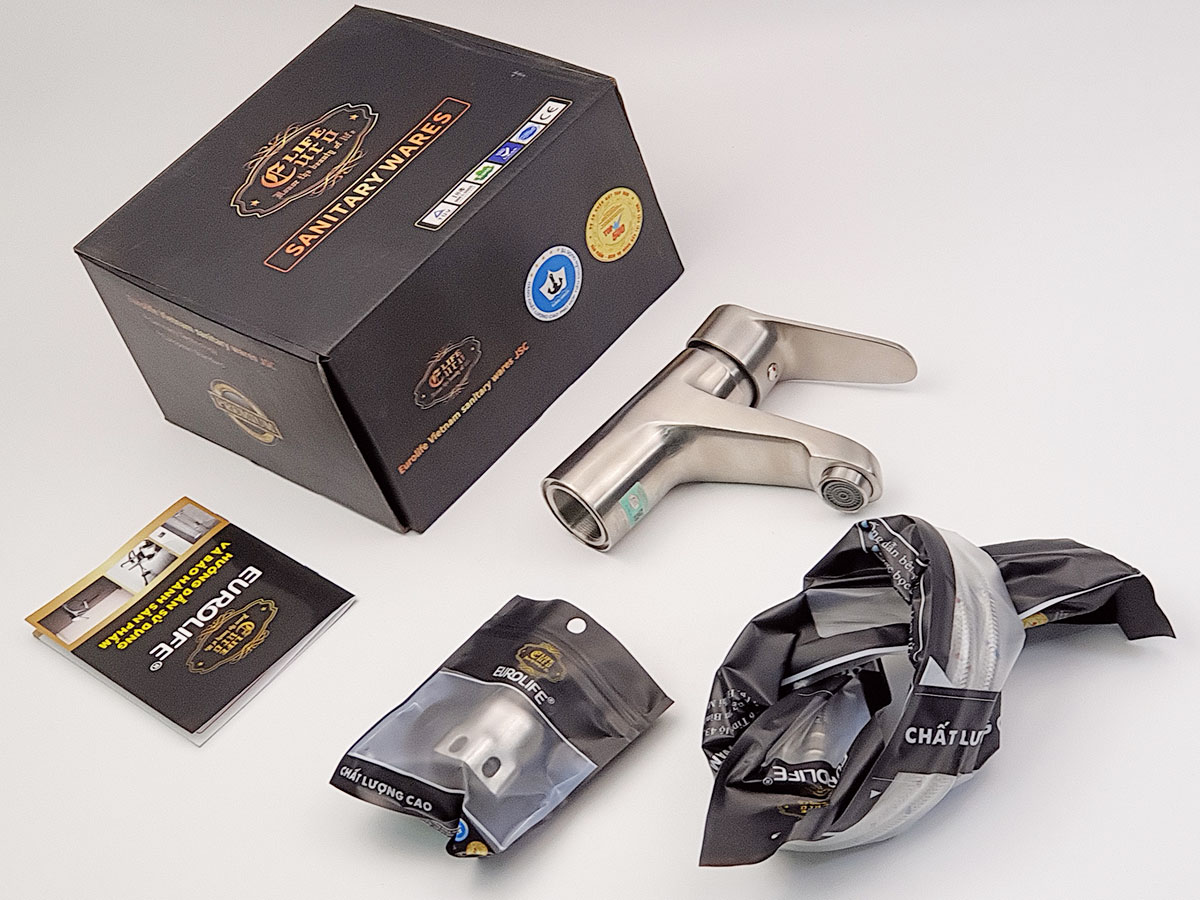 • Bộ sản phẩm được đóng gói trong túi vải cotton, hộp màu riêng của Eurolife. Bộ sản phẩm đầy đủ bao gồm : Thân vòi Lavabo, 1 bát gắn, 2 roong cao su, 2 dây cấp 60cm, 1 phiếu bảo hành chính hãng.
