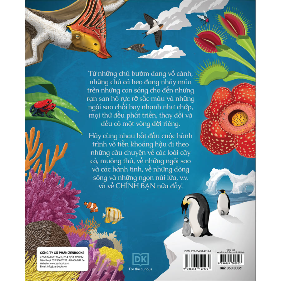 Từ những chú bướm đang vỗ cánh, những chú cá heo đang nhảy múa trên những con sóng cho đến những rạn san hô rực rỡ sắc màu và những ngôi sao chổi bay nhanh như chớp, mọi thứ đều phát triển, thay đổi và đều có một vòng đời riêng. Hãy cùng nhau bắt đầu cuộc hành trình vô tiền khoáng hậu đi theo những câu chuyện về các loài cây cỏ, muông thú, về những ngôi sao và các hành tinh, về những dòng sông và những ngọn núi lửa, và về chính bạn nữa đấy!