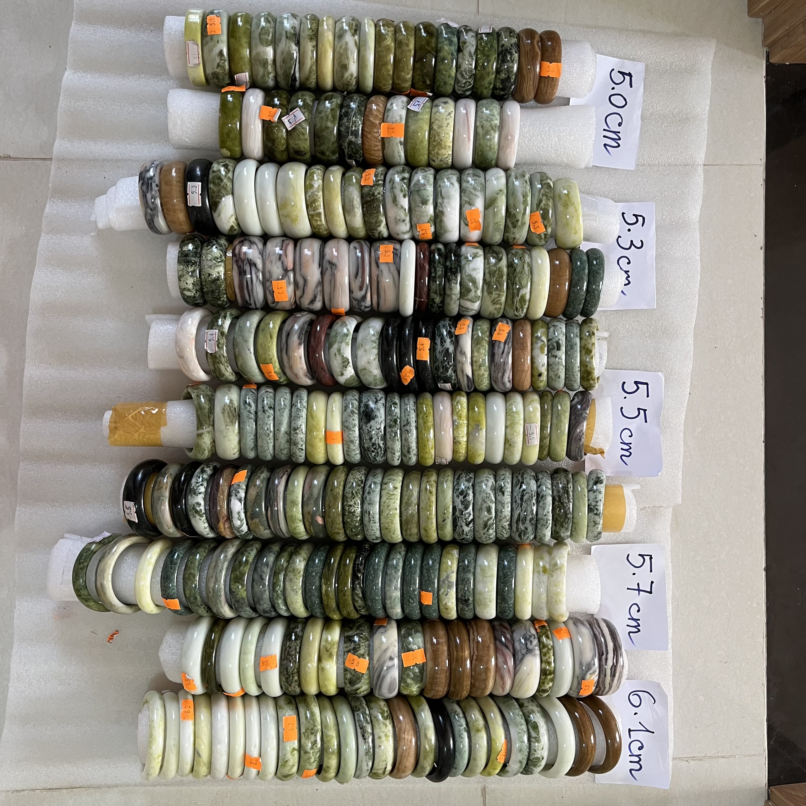 Có nhiều size cho khách lựa chọn 2. CÁCH ĐO TAY VÀ ĐẶT CỠ VÒNG VỪA TAY. Nếu có thước dây thì bạn lấy thước dây, nếu không có thước dây thì bạn cắt miếng giấy hay vật tương tự miếng giấy (không co giãn), miếng giấy cắt dài cỡ 25 cm rộng cỡ 1cm, sau đó bạn cuốn xung quanh khum tay (gù bàn tay) cần đeo ( tức là chỗ to nhất của bàn tay khi bạn khum bàn tay lại với mục đích là để cho vòng lọt qua khum tay bàn tay). Khi hai đầu dây chạm vào nhau thì bạn đánh dấu lại và đo xem nó dài bao nhiêu. Chiều dài của đoạn dây đo được chính là chu vi vòng tay của bạn. Size vòng là đường kính lọt lòng của vòng. Được bao nhiêu bạn đối chiếu số liệu dưới đây: Chu vi tay là 16 cm thì size 5.0 cm Chu vi tay là 17 cm thì size 5.2 cm Chu vi tay là 18 cm thì size 5.4 cm Chu vi tay là 19 cm thì size 5.6 cm Chu vi tay là 20 cm thì size 5.8 cm Chu vi tay là 21 cm thì size 6.0 cm Chu vi tay là 22 cm thì size 6.2 cm SIZE CỦA VÒNG ĐƯỢC VIÊT BÊN TAY PHẢI. KHÁCH CÓ THỂ CHỌN CHIẾC KHÁCH THÍCH HOẶC CÓ THỂ NHẮN CHO SHOP ĐỂ LẤY SIZE VÒNG VỪA TAY. NẾU KHÔNG VỪA SHOP SẼ ĐỔI CHO BẠN