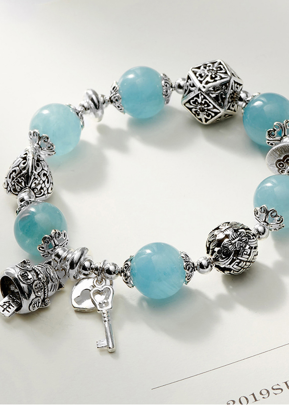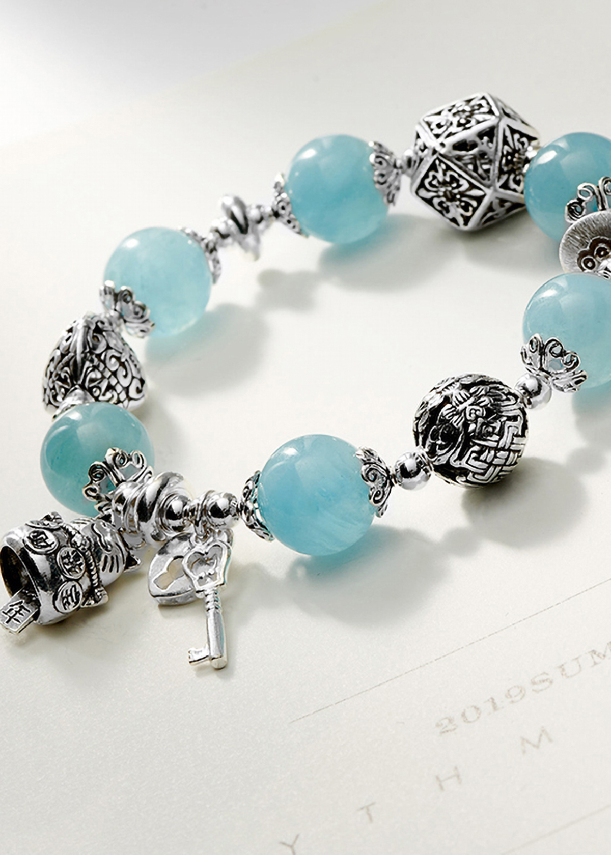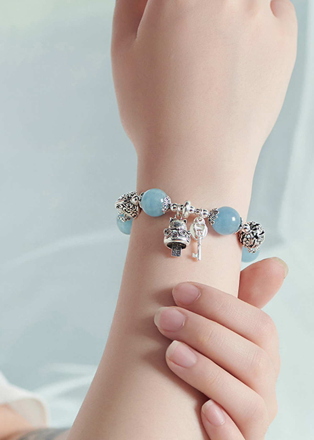 VÒNG TAY ĐÁ AQUAMARINE PHỐI CHARM MÈO BẠC: