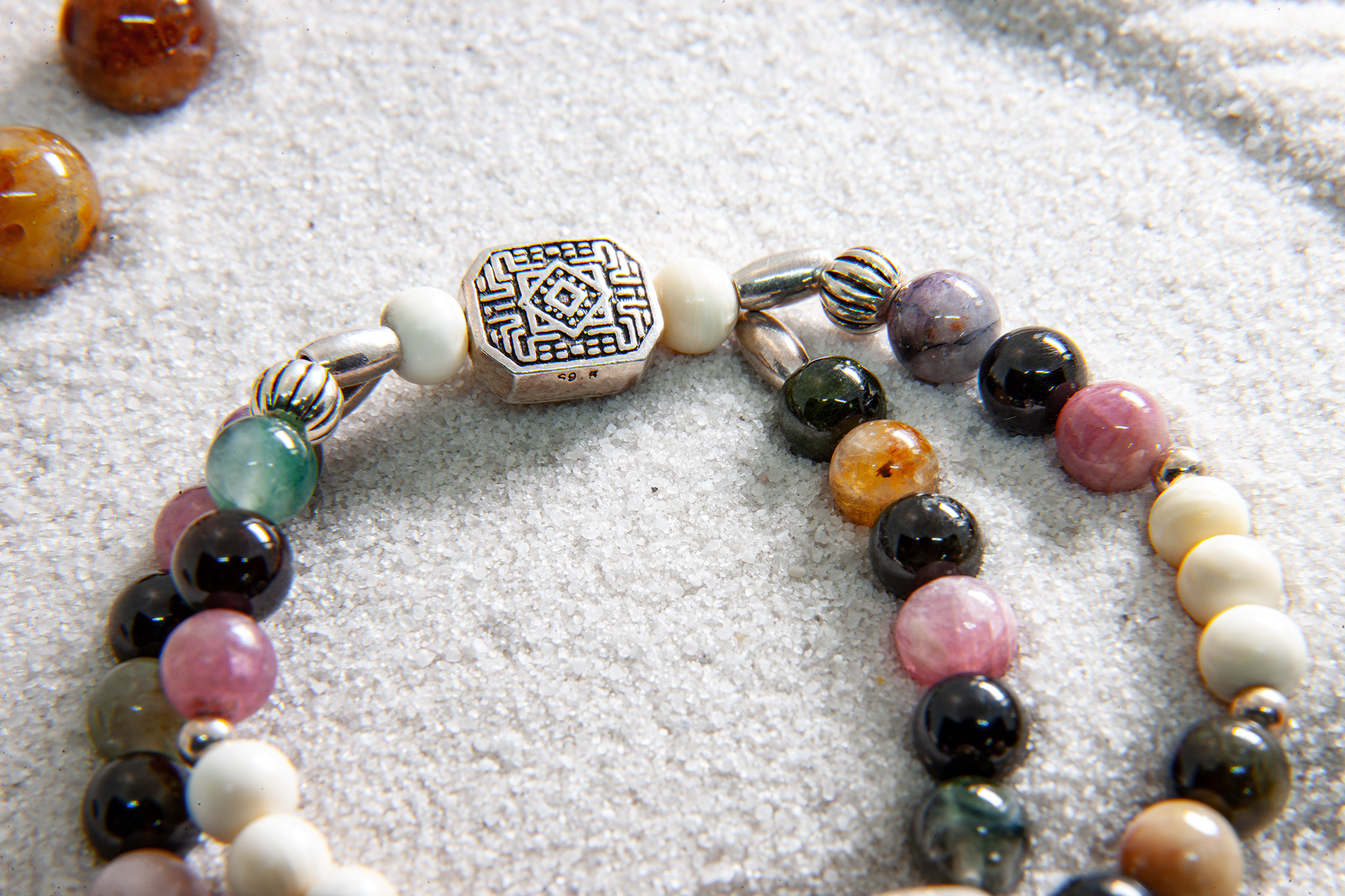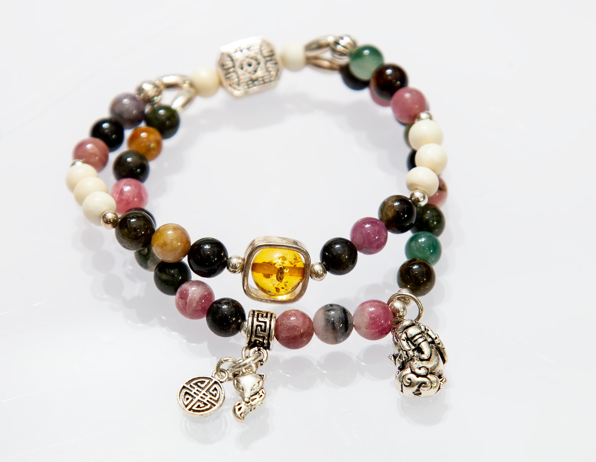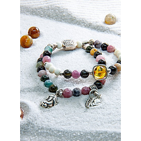 Một vòng tay với 33 viên Tourmaline đa sắc thiên nhiên 6-6.5mm, ẩn giấu một vẻ đẹp từ sâu bên trong, nồng nàn và sâu lắng, đong đầy tình yêu thương, một viên hổ phách (amber) tự nhiên 8.5mm vàng óng, trong veo, nổi bật đầy kiêu hãnh, và bộ charm tỳ hươu bênh cạnh hồ ly chiêu tài bạc 92.5% đẹp kín đáo, xinh xắn, mượt mà và bay bổng, quyến rũ đến mê hoặc.