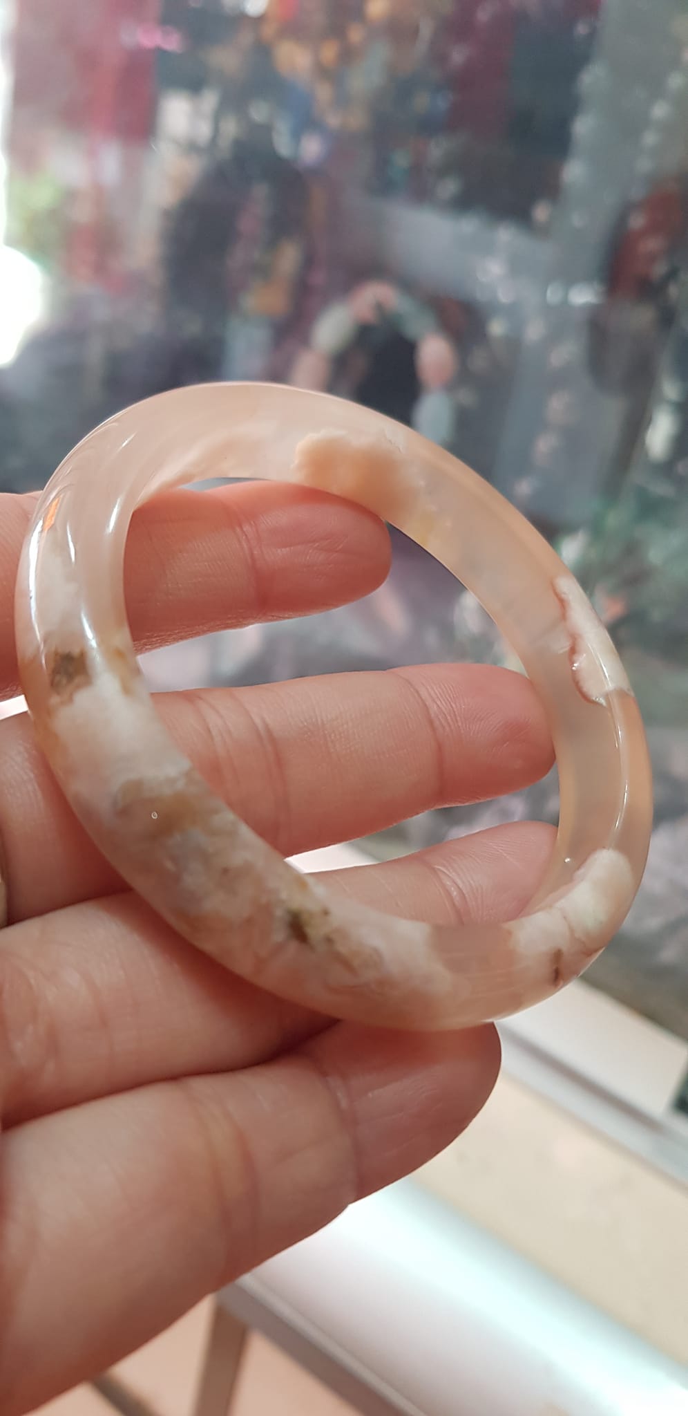 ✨Vòng tay Nữ Bản Hẹ Mới Đá Mã Não Bông Tuyết Hồng nhẹ trắng trong bóng quá đẹp luôn ạ Vòng Ni 53mm x Cao 11mm x dầy 7mm Nữ Cân nặng 52kg - 55kg đeo xinh tay đẹp lắm ạ