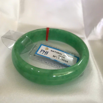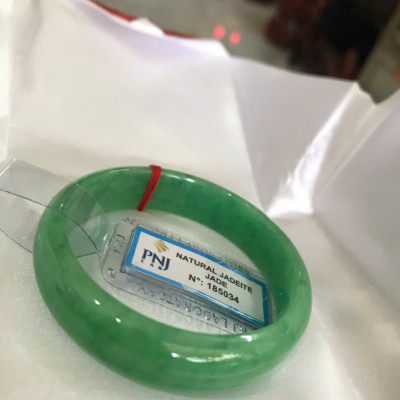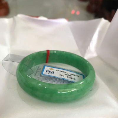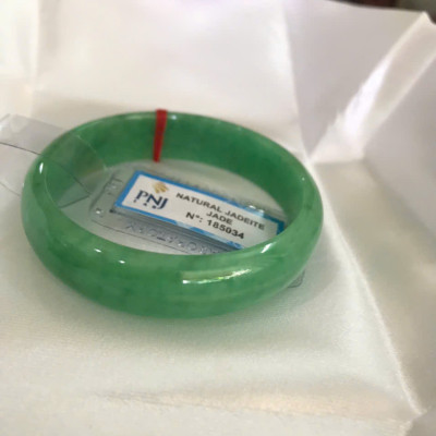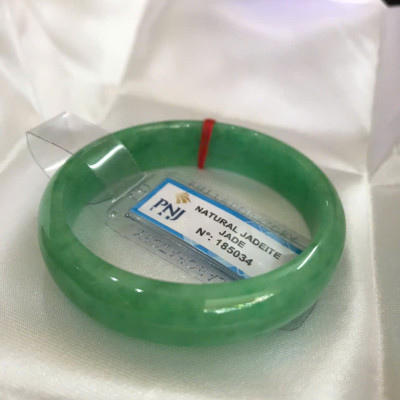 Vòng Tay Nữ Đá Ngọc Cẩm Thạch Tự Nhiên Bản Hẹ Sịn Đậu Lý Sao Ni 48mm Cao 12mm Dầy 6mm đã kiểm định kèm giấy chứng nhận P No 185034 Màu Xanh ngọc lý tươi bóng đều đẹp nữ tay nhỏ 35kg - 48kg ạ