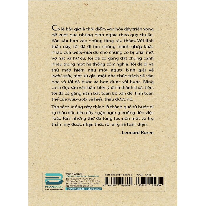 "Có lẽ bây giờ là thời điểm văn hóa đầy triển vọng để vượt qua những định nghĩa theo quy chuẩn, đào sâu hơn vào những tầng sâu thẳm. Với tinh thần này, tôi đã đi tìm những mảnh ghép khác nhau của wabi-sabi dù cho chủng có bị phai mờ, vỡ nát và hư cũ, tôi đã cố gắng đặt chúng cạnh nhau trong một hệ thống có ý nghĩa. Tôi đã đi và thử mạo hiểm như một người bình giải về wabi-sabi, một sử gia, một nhà chức trách về văn hóa và tôi đã bước xa hơn được vài bước. Bằng cách đọc sâu văn bản, biến ý định thành thực tiễn, tôi đã cố gắng nắm bắt toàn bộ vấn đề, tính toàn thể của wabi-sabi và hiểu thấu được nó. Tập sách mỏng này chính là thành quả từ bước đi tự thân đầu tiên đầy ngập ngừng hướng đến việc “bảo tồn” những thứ đã từng tạo nên một vũ trụ thẩm mỹ được nhận thức rõ ràng và toàn diện." - Leonard Koren