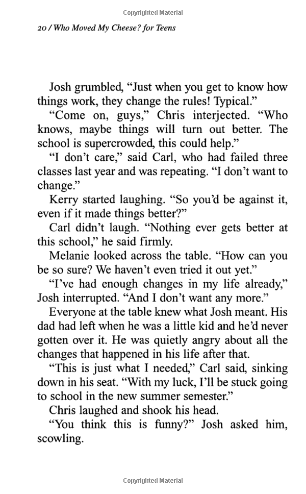 Teenagers' lives are full of change and this simple book will help them cope with the unique problems that face them every day, such as doing well at school, making career decisions, dealing with parents, relationships and dating, feeling good about themselves and being positive about the future. A group of teenagers are worried about changes in their lives. To help them out, Chris tells the story of Who Moved My Cheese. Four characters, Hem, Haw, Sniff and Scurry, search through a maze for cheese, to nourish them and make them happy, but soon the cheese runs out. Sniff and Scurry go off in search for more, but Hem and Haw stay to work out what went wrong and wait for more cheese. Eventually, Haw realises that no new cheese is coming, so he sets out into the maze and eventually finds new cheese. The group then discusses the story, finding ways to apply it to their own lives. Who Moved My Cheese? for Teens is an essential book for teenagers - an entertaining parable that reveals profound truths and insights that will last a lifetime .