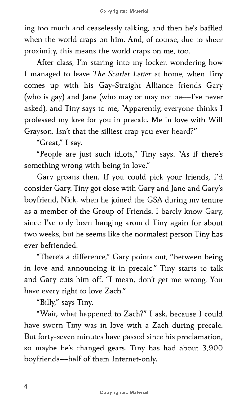 One cold night, in a most unlikely corner of Chicago, Will Grayson crosses paths with . . . Will Grayson. Two guys with the same name, running in two very different circles, suddenly find their lives going in new and unexpected directions, and culminating in epic turns-of-heart and the most fabulous musical ever to grace the high-school stage.