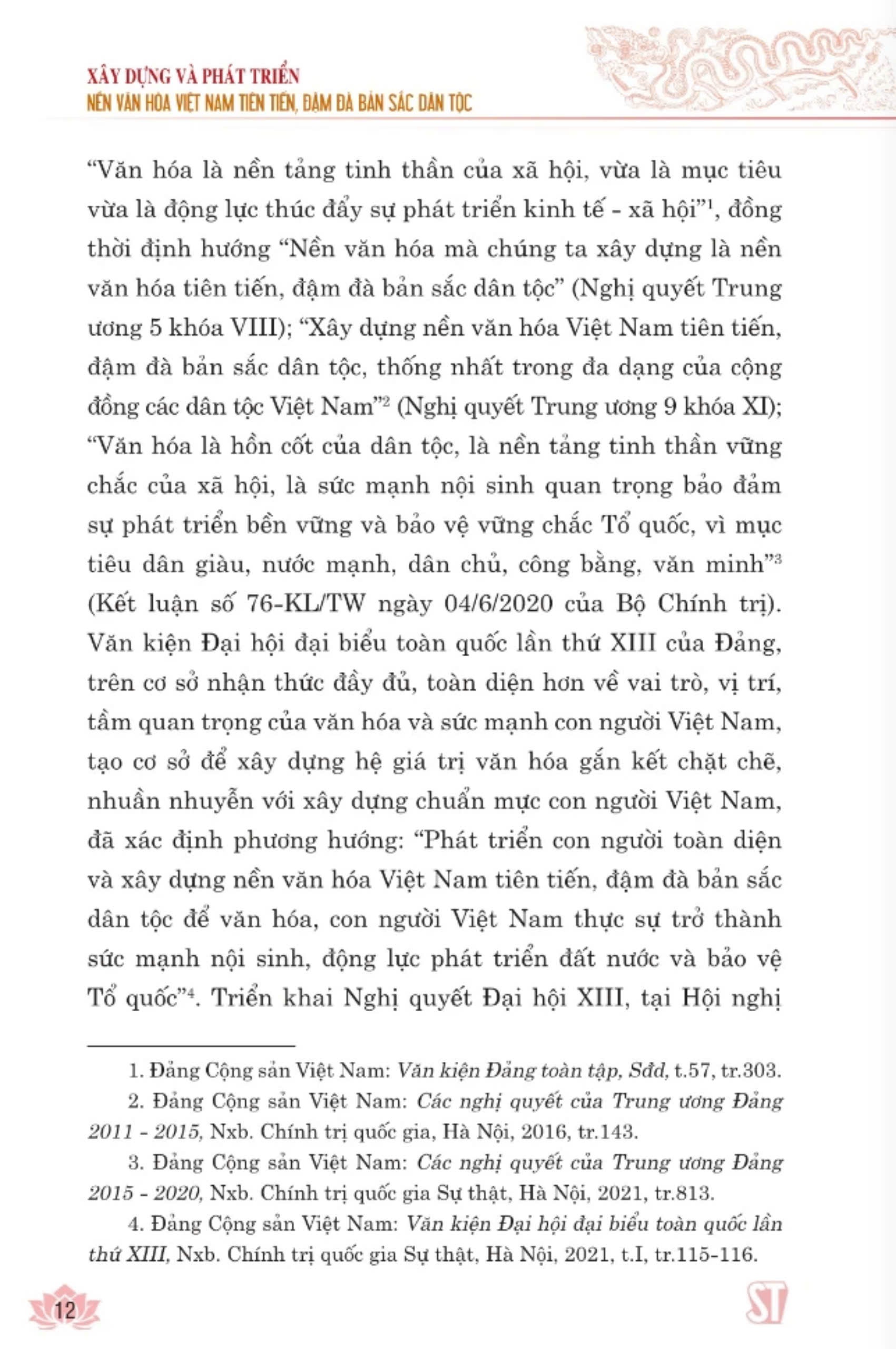 Nhằm hệ thống sự lãnh đạo, chỉ đạo của Đảng, đứng đầu là đồng chí Tổng Bí thư Nguyễn Phú Trọng, về xây dựng và phát triển nền văn hóa Việt Nam tiên tiến, đậm đà bản sắc dân tộc, giúp các ngành, các cấp, các địa phương, cán bộ, đảng viên, Nhân dân xác định rõ quan điểm, mục tiêu, định hướng, nhiệm vụ phát triển văn hóa, để văn hóa thực sự trở thành nền tảng tinh thần, động lực và nguồn lực nội sinh cho phát triển đất nước, Ban Tuyên giáo Trung ương chủ trì, phối hợp với Bộ Văn hóa, Thể thao và Du lịch, Nhà xuất bản Chính trị quốc gia Sự thật xuất bản cuốn sách Xây dựng và phát triển nền văn hóa Việt Nam tiên tiến, đậm đà bản sắc dân tộc của đồng chí Tổng Bí thư Nguyễn Phú Trọng.