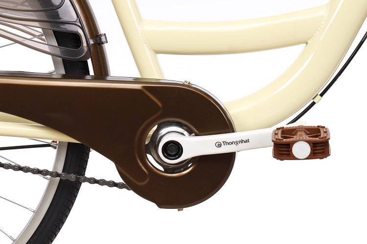 - Bàn đạp: Nhựa PVC trục thép Khung sườn với thiết kế uốn cong mềm mại, lớp sơn tĩnh điện nhiều màu sắc sở hữu thiết kế phần khung sườn xe đầy cá tính, chất liệu hoàn toàn từ hợp kim chịu lực tốt, lên đến 140 kg. Có khả năng chống ăn mòn, rỉ sét bởi sự bảo vệ của lớp sơn tĩnh điện bóng loáng. Trọng lượng xe 16 kg nhỏ gọn phục vụ cho các hoạt động thường ngày như đi học, đi chợ, đi dạo phố. Phần bàn đạp tối ưu chiều cao cho các bạn trẻ, đảm bảo ngồi đúng tư thế cho sức khỏe luôn tốt, phù hợp với các bạn có chiều cao từ 1m5 đến 1m75. Bánh xe 26 inch, vành xe cứng cáp Bánh xe của chiếc xe đạt kích cỡ , người dùng dễ dàng điều khiển xe khi đi vào địa hình hẹp như hẻm, đường mòành hợp kim cứng cáp, chống ăn mòn, dễ dàng vệ sinh. Ghi đông linh hoạt, dễ kiểm soát Kiểu dáng ghi đông cong cũng đem lại cho bạn tư thế đạp xe thoải mái, tránh hiện tượng mỏi vai, đau lưng khi di chuyển lâu. An toàn hơn với hệ thống phanh vành trước và phanh đùm sau Phanh xe là bộ phận quan trọng giúp bạn kiểm soát tốc độ. Dòng xe này sử dụng hệ thống gồm phanh vành trước và phanh đùm ở bánh sau giúp cải thiện độ an toàn và chính xác khi phanh. Xe đạp Thống Nhất New 26 sử dụng phanh vành cho bánh trước và phanh đùm cho bánh xe sau. Cả 2 phanh đều dễ dàng điều khiển để có thể tự kiểm soát tốc độ phù hợp trong mọi tình huống, từ đi trong cung đường trơn trượt đến những đoạn thả dốc giúp chúng ta yên tâm hơn. Yên xe mềm dễ dàng điều chỉnh chiều cao Yên xe được bọc nệm đàn hồi tốt, hình dáng nhỏ gọn giúp mọi người có được sự dễ chịu khi tham gia những hoạt động đạp xe ngoài trời cùng bạn bè, người thân. Cốt yên bằng inox khả năng chịu lực tốt, dễ dàng bảo trì đem lại trải nghiệm an toàn cho người dùng. Các tiện ích có sẵn vô cùng tiện lợi Xe đạp New 26 có phần màu nâu giúp người lái có thể đem thêm nhiều đồ đạc yêu thích theo bên mình. Trang bị phía sau để chở thêm bạn đồng hành suốt quãng đường. Bên cạnh đó, xe còn có đi kèm tiện lợi cùng chuông reng nhỏ nhắn được kẹp cố định trên ghi đông giúp các bạn dễ dàng ra hiệu trước những tình huống cần thiết.