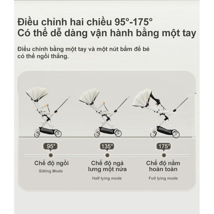 Chào mừng ba mẹ đến với thế giới của sự tiện nghi và an toàn tối ưu cho bé yêu cùng xe đẩy vừa nằm vừa ngồi cho bé Luxury MySun cao cấp! MySun tin rằng sản phẩm này không chỉ là một chiếc xe đẩy cho em bé sơ sinh thông thường mà còn là người bạn đồng hành đáng tin cậy trong suốt những năm tháng đầu đời của bé, từ sơ sinh đến 4 tuổi. Với thiết kế thông minh, khả năng gấp gọn tiện lợi và chất liệu cao cấp, xe đẩy cho trẻ sơ sinh MySun Luxury mang đến trải nghiệm tuyệt vời cho ba mẹ và bé. Từ những chuyến đi dạo công viên, đến những buổi mua sắm hay du lịch, chiếc xe đẩy cho em bé gấp gọn Luxury giúp ba mẹ dễ dàng di chuyển mà không lo lắng về sự an toàn hay thoải mái của bé. MySun còn thiết kế đặc biệt để sản phẩm phù hợp với xe đẩy cho em bé từ 1 2 3 4 5 6 tháng tuổi và các bé lớn hơn, đảm bảo sự nâng đỡ êm ái và an toàn tuyệt đối.   ƯU ĐIỂM XE ĐẨY VỪA NẰM VỪA NGỒI CHO EM BÉ SƠ SINH 1 2 3 4 TUỔI LUXURY MYSUN     1. Khung xe đẩy cho em bé làm bằng thép carbon cao cấp chịu tải 25kg. 2. Bánh trước lò xo, xoay 360 độ giúp xe đẩy em bé chạy êm ái. 3. Bánh sau xe đẩy có khóa cố định cho em bé vừa nằm vừa ngồi an toàn. 4. Xe đẩy gấp gọn hay mở ra chỉ bằng 1 thao tác 1 tay đơn giản. 5. Xe có 2 lớp vải, lớp ngoài Oxford siêu bền, lớp trong poly thoáng khí. 6. Xe đẩy MySun có đệm lót cao cấp cho em bé từ 1 2 3 4 5 6 tháng tuổi nằm êm ái. 7. Mái che xe đẩy gấp gọn vải oxford chống nước chống tia UV cho em bé. 8. Xe đẩy vừa nằm cho bé sơ sinh, vừa ngồi cho trẻ em 1 2 3 4 tuổi. 9. Đai 5 điểm an toàn cho em bé sơ sinh nằm và trẻ 1 2 3 4 tuổi ngồi. 10. Có khay đựng cốc, túi sau, giỏ đựng đồ cho ba mẹ và bé tiện lợi.