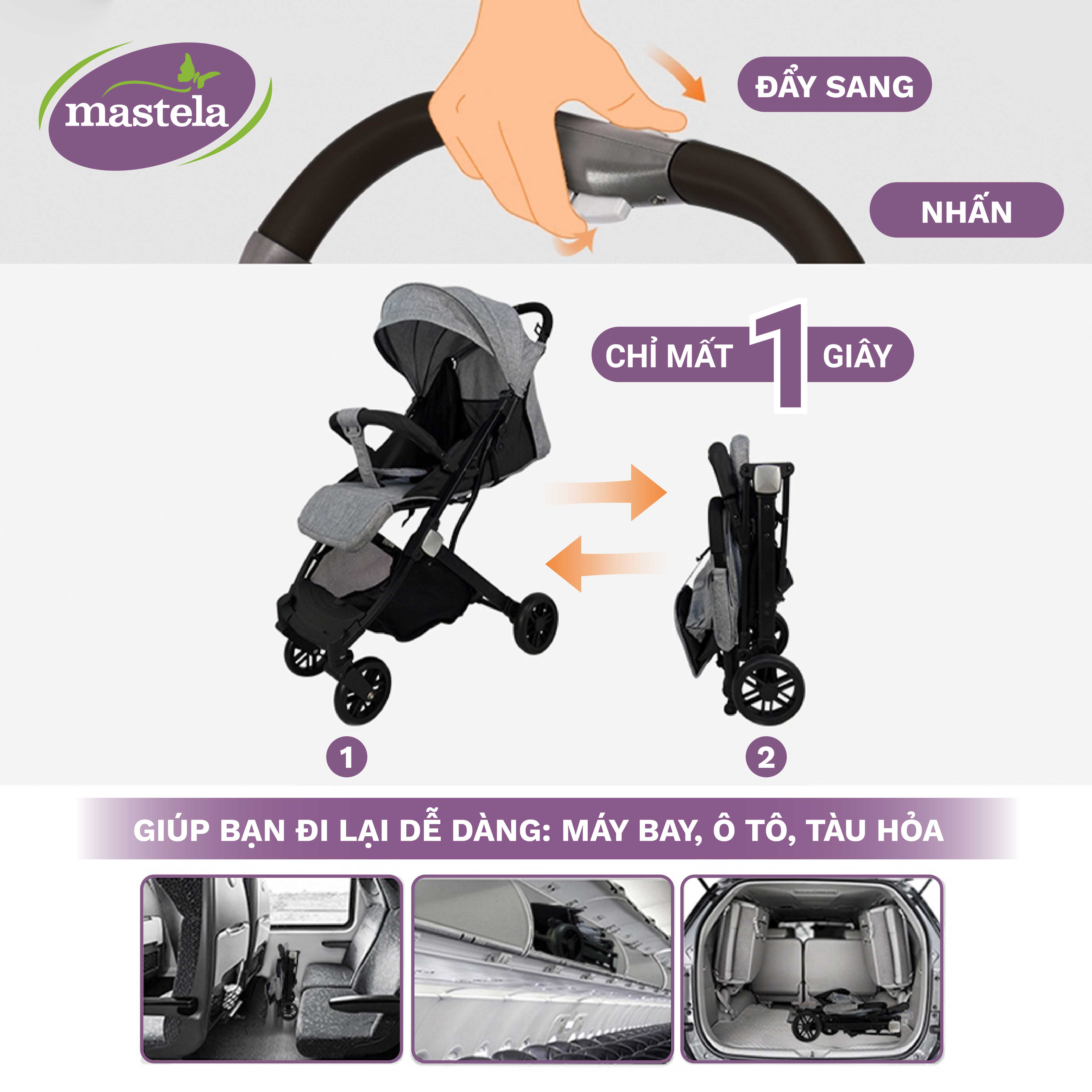 Cải tiến mới từ MSTL 275 giúp Ba Mẹ gập gọn dễ dàng chỉ bằng một nút bấm. Kích thước gập gọn siêu nhỏ, dễ dàng xách bằng tay hoặc dùng tay kéo ,vừa vặn trong cốp xe hay khoang máy bay cho những chuyến du lịch xa.